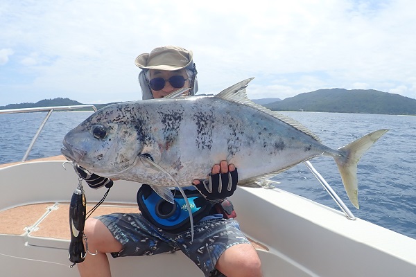 | 昨日までの時化も少しずつ治まりつつある西表島。今日はリピーター様とGT狙いへ行って来ました。まずは肩慣らしに網取湾内からスタート! 風も波もない湾内、カンムリワシの鳴き声を聞きながら、このロケーションでキャスティングはとっても贅沢です。1バイトありましたが針に掛からず、湾の外でグルクンのナブラ打ちへ。こちらもチェイスなどはありましたがいまいち魚の活性が良くない感じ。気分を変えて湾内ジギングへ! オオメカマスの連発から、良い反応にジグを落として1チャクリで、 出ました!アーラミーバイ!!4〜5kg程の個体でしたが、船長・釣り人共に気持ちの良い1尾となりました。明日は島の南側へ遠出予定。 GTさん、宜しくお願い致します。 |