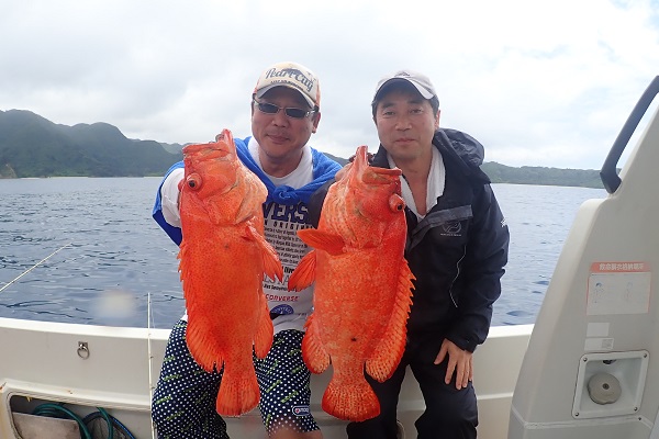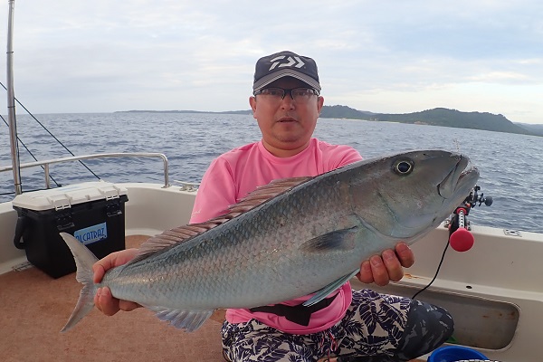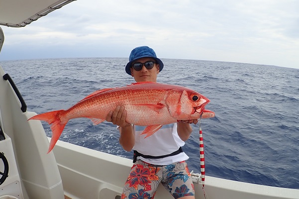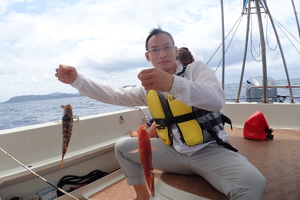| ベタ凪続きの西表島。今日は居酒屋を先に予約して、出船です。釣れないと帰れない!食べれる魚が釣れるよう頑張ってきました。 開始1投目は水深40mの岩礁帯。潮の流れが早すぎて、もっと浅瀬へ移動!しかし回収している仕掛けには可愛いハタが付いていました。 その後、リーフ近くの水深30mへ。フォール中にアタリがあり、とっても力強い引き、上げてビックリの良型オオメカマスでした!刺身・塩焼き・唐揚げと何にしても美味しいです!お父さんも負けじと、 オジサンをゲット!無事に食材確保をした体験フィッシングでした。 |