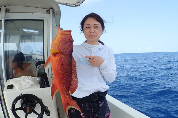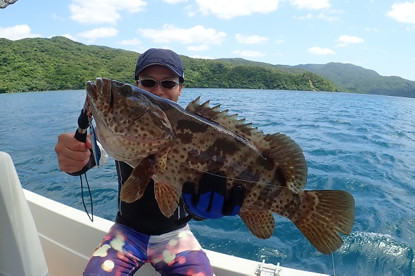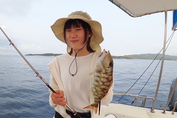 | ほどよく風があり、とっても気持ちの良い天気。今日は午前中体験フィッシングへ行って来ました。 潮の流れも緩めで釣りやすい!しかし魚のアタリは小さく1匹釣るのに大苦戦。サメの活性は高く、掛けた魚をサメに獲られてしまいます。 やっと釣れた傷のない1尾。そしてその後に、 体験フィッシングとしてはかなりBIGな魚、バラハタです。シガテラ毒にあたることもあるのでリリースしましたが、このサイズのハタは嬉しいです。おめでとうございます! |