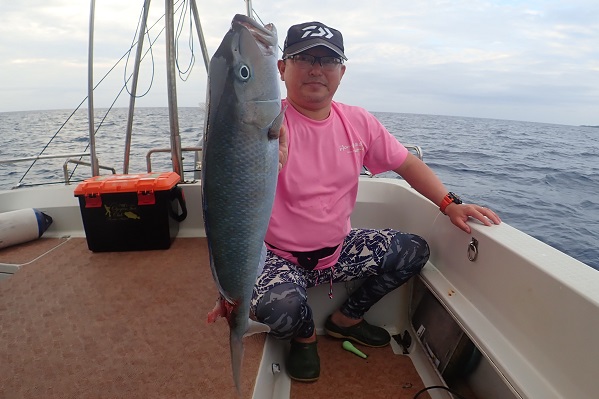 | 波1mまで落ち、風もほぼ無風ととっても気持ちの良い夕方。 サンセットフィッシングへファミリーでご参加頂きました。 ニジハタなどを釣り、楽しもうと思っていた最初の1匹目は良型ナンヨウカイワリです!ドラグを出すいいサイズでした。 時間が経つごとに表情を変える海の色。贅沢な時間を堪能していただきました。明日の夕食は魚を存分に堪能して下さい。 |