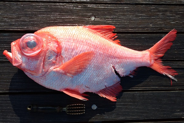 | 3日間の深海ジギングでアカマチ狙い!ジグ350〜600gを使い、水深280〜550mで狙ってきました。 初日は水深300mのポイントでもラインは400m以上出る程の激流。 潮の速さに悩まされて1日頑張ってもらいましたがノーバイト。 2日目は前日より潮は緩くなったものの、まだラインは水深以上にかなり出されます。そんな中でも、 ジグでギンメダイ!ディープライナー スピンドル500gでした。 その後は餌で、 サメに少しかじられましたが、巨大なナンヨウキンメ!ミニアカマチ、深海ビタローなどちょこちょこアタリはありました。 |