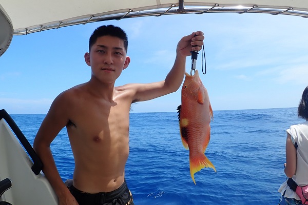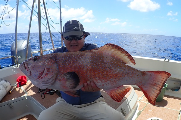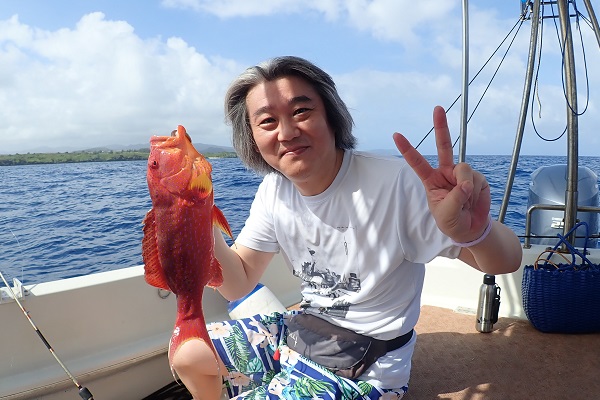 | 昨日の体験フィッシングへご参加して頂いたお客様が、いつかは泳がせ釣りにチャレンジしてみたいとのことで、早速行って来ました。 まずはグルクン釣りからですが、群れはいるのに全く食わない時間が1時間、ポイント3か所目にして20〜30匹ほど確保! 開始2投目にして綺麗なアカジンを見事キャッチしていただきました! 今日の大本命アカジンです。その後はサメの攻撃が多数あり、瀬を大きく移動。移動した後もサメはいますが、大きなハタらしきブレイクも多数経験しました。ハリスを太くして再挑戦して、 約5kgのコクハンアラを船長のサポート付きで釣り上げてもらいました!ようやく上がってこのサイズ、さっきまで掛けてた魚はもっとでかかったかも!?是非また大きいの狙いに来てくださいね。 |