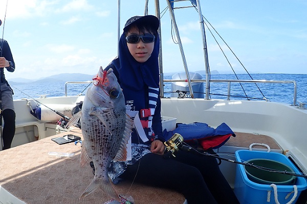 | 今日のゲストは毎年遊びに来て頂いている釣り好き親子。なにやら台風になりそうな低気圧がありますが、うねりが入る前に大物狙いです。 餌釣り・タイラバで数釣りを楽しみ、餌になる魚が釣れたら泳がせ釣り予定です。 釣り開始時から魚の活性はかなり高く、フエフキダイ・バラハタ・カワハギなど仕掛けを落とせば簡単に釣れる!まさに入れ食いです。 そんな良い潮のタイミングで、餌に丁度良いサイズのオジサンを釣り上げて、泳がせ釣りをしてみれば、 仕掛けを落として数十秒、竿先が水面に突き刺さりバトル開始!って言っても電動リールなのでレバーを上げるだけですが、魚が上がってきてビックリのコクハンアラでした。お腹のたるみが凄いっ!! その後は湾内でまったり昼食をとり、時間まで餌釣りで色々な魚種追加となりました。 今年もアカジンおめでとうございます。また来年お待ちしております。 |