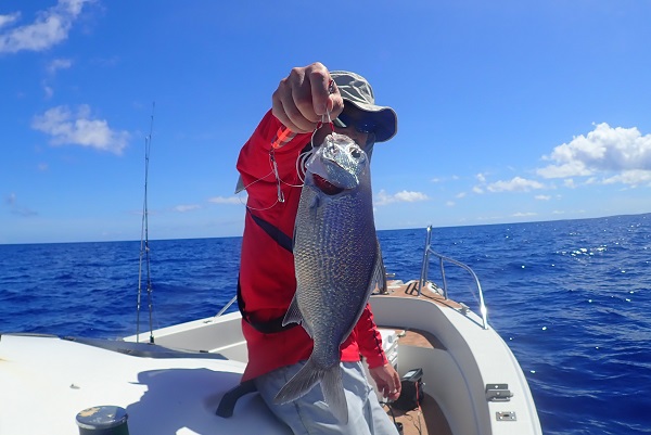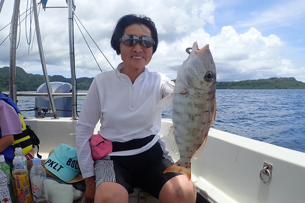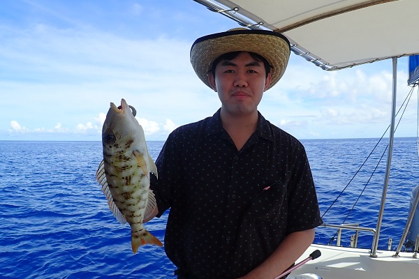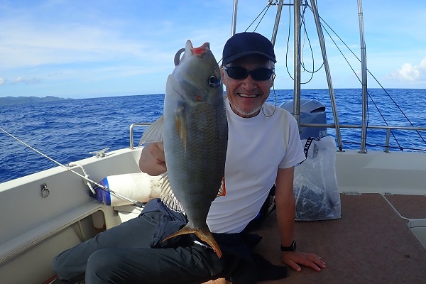 | 午後からもサメの被害を心配しましたが、被害ゼロ!それどころか、フエフキダイが入れ食いです!! ダブルヒットも数回するほど魚の活性が良し。フエフキダイはたくさん釣ったので、ミミジャー狙いでポイントに入ると、 良い引きしてくれた良型ミミジャーを狙い通りに即キャッチ!!その後も狙い続けましたが残念ながら1匹追加のみ。シロダイ、タテジマフエフキ・ハナフエフキ・ヨスジフエダイなどたくさん釣れた半日でした。 |
