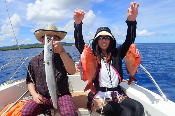 | まだまだ波1mのうみ日和が続いています!今日は体験フィッシングの予定で乗り合いで出船。しかし大物を釣りたいとのリクエストを頂き、急遽半日チャーターの料金で3名様を沖へご案内です! さすが大潮って位の潮の速さ。しかし大型魚の活性は良いみたいで、釣れたフエフキダイを食べに来たり、 良型シロダイが水深50mで食ってきたり、カマスの群れが通過すればフォールで掛かり、ミミジャーもダブル釣り成功! サメには悩まされず、美味しいお魚連発の半日チャーターでした。 |