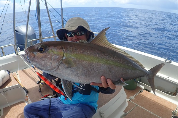 | 昨日の体験フィッシングへご参加して頂いたご家族が、大物狙いのサンセットチャーターでご参加して頂きました。 まずは餌となるグルクンが生簀に余っているので、アカジンポイントでライト泳がせ釣りです。 泳がせ1投目は大物に引っ張られてラインブレイク、2投目はサメ、3投目で狙い通りのアカジンをキャッチ!!その満足そうな顔・・・。 その後は餌釣りにして、美味しいミミジャー狙いへ。 3人同時のヒット!狙い通りミミジャーを釣り上げていただきました。 2日連続ご参加ということもあり、必ず釣ってもらうためにあっちこっち走り回ったサンセットチャーターでした。 |