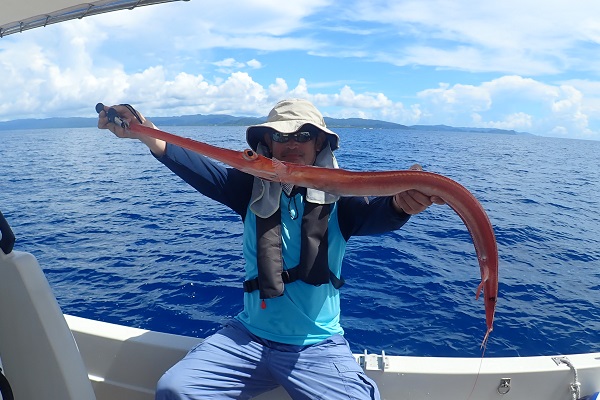 | 最終日の今日は一番の実績ポイントからスタート。何が何でもちゃんと釣って帰ってもらいたいです。 初めのポイントは290→320mのかけ下がり。アカマチ・オオクチハマダイ・カンパチなどが釣れるポイントでしたが、まさかのカンナギ!? 着底後に数メートル糸ふけを取り、5〜6アクション目で竿が大きく曲り根掛かり?って思いましたが、重機を相手にしてるかの様なずっしり重い引きこみ。なすすべなくアシストが1つとび、もう1つは針が大きく伸びてました。その後反応が無いので大移動。移動後は、 食いが良くなったのか、魚探の反応に落とせば素直に魚が釣れます。 7kgのヒレナガカンパチに始まり、ジャンボ・アカヤガラ!最後は可愛いクロムツで最終日終了です。 3日間お疲れ様でした。海況も良く毎日沖へ出れましたが、魚の機嫌が悪く大苦戦した3日間でした。本命はまた今度釣りに来てくださいね。 |
