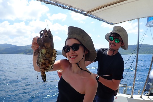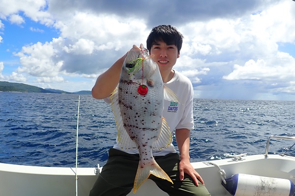 | 今日は久しぶりに体験フィッシングへ行って来ました。うねりもまだ大きい為、波がないポイントまで行って来ました。 釣り開始1投目でナガジューミーバイが釣れ、2投目でフエフダキイのダブルヒット!今日は魚の活性が高いみたいです。 その後は雨に降られながらも良型ハナフエフキを見事ゲット! ウミガメもたくさん見れてまったり楽しい体験フィッシングでした。 |