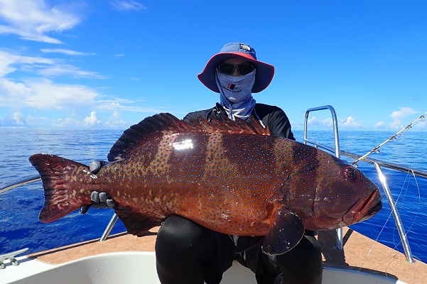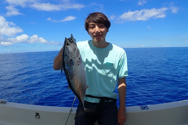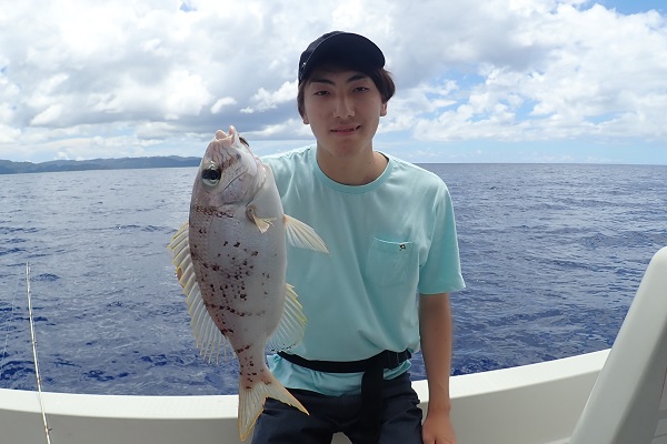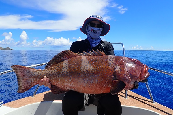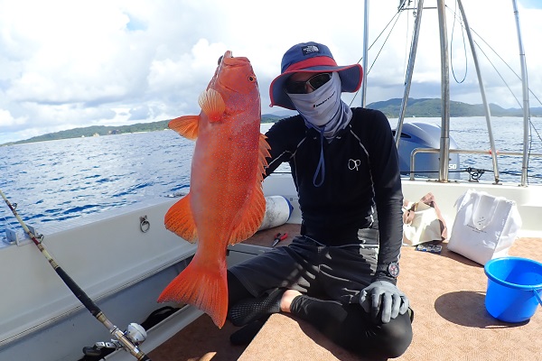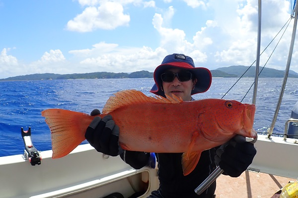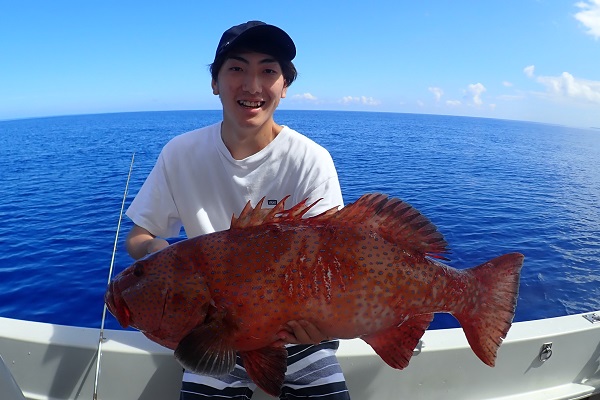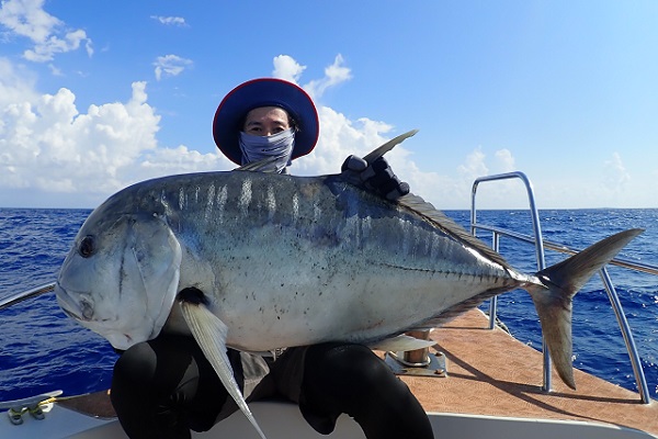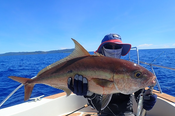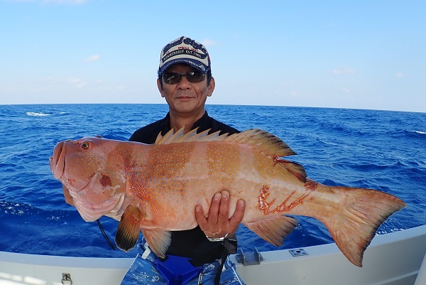 | 常連さん最終日。今日は前日に釣ったグルクンを餌に前から気になっていた水深100〜130mのポイントでモンスター狩りです。 PE10号・リーダー80号・ハリス60〜80号・スーパークエ35号を使ってドラグを出さないガチンコファイトです。 ポイント到着1投目。ドラグ設定が甘く、即根に潜られて全く出てくる気配なし。2投目は底から5mの所で掛けましたが、そのまま海底へ一直線でハリス・リーダー共に根ズレでラインブレイク。3度目の正直で、 27kgのロウニンアジ!ファーストランは強烈でしたが、さっきまで相手にしていたサイズに比べれば余裕のファイト。おめでとうございます。 波も高くなってきたので、帰り間際のポイントで今晩のおかずのアカジン狙いで水深50mを流して、 アカジン連発で、5kg超えのコウクハンアラが簡単に釣れちゃいました。 この5日間で何キロの魚を釣ったのか!?美味しいお土産がたくさん釣れて良かったです!来月もまたお待ちしておりますね〜 |