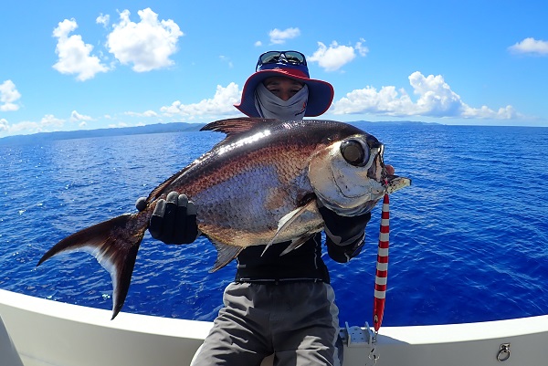 | 台風前の静かなタイミングでプライベート深海ジギング。本命はカンナギ・10kg超えのカンパチ、アカマチです。 ポイント到着後の1流し目、日の出と共に釣り開始。着底後、元気良くジグを動かしていると強烈なバイト!巻いては出されてを繰り返し、30分かけて上がってきたのはニタリの尾鰭にスレ掛かり。完全に朝一から疲れました・・。2流し目もベイト反応ばっちりポイントで、 沖縄3大高級魚のアカマチです!shoutのSTAY ゼブラグロー500g 着底後ゆっくりなフォール3〜4回目でヒットでした。 その後も大型を狙うも食い付いてくるのはオオクチハマダイばかり・・。 深海ジギングお馴染みのヒレナガユメタチもジグを丸飲みして鰓からジグが出てます。shout ショーテル ゼブラグロー400gです。 アカマチ2匹・オオクチハマダイ2匹・クロムツ1匹・ヒレナガユメタチ1匹とアタリの多い1日でした。1日でトータル何メートルリールを巻いただろうか。台風前の楽しい1日でした。 |