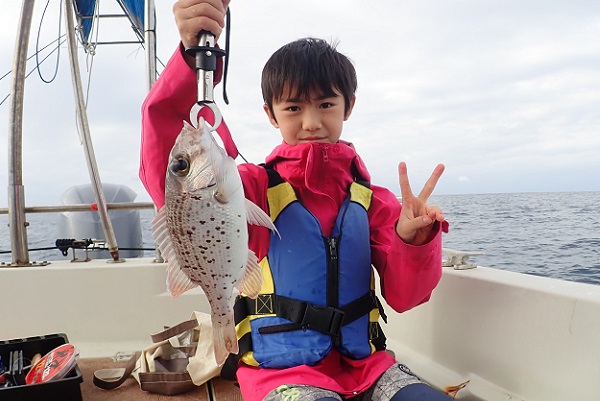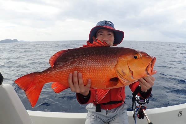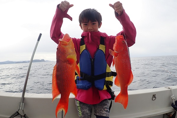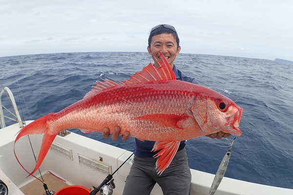 | 常連さん最終日は波が多少落ち着いたので、子供達も一緒にジギング&タイラバで美味しいお魚狙いです。相変わらず沖に行けば行くほど軽石が大量に流れているので、水深80mから釣りスタート。 開始早々ジギングでカイワリ・フエフキダイなどが釣れ、タイラバをしていたお姉ちゃんにもドラグを出す良型がヒット!!上げてみれば謎のフエフキダイです。キツネに似ている雰囲気ですが顔が長くない・・・。 その後は水深40〜60mへ移動してアカジン狙い。 ミミジャーから始まり、ムルーの入れ食い、ナガジューミーバイも多数とアカジンは不在でしたが数釣りが楽しめました。 |