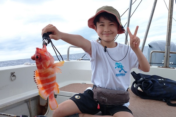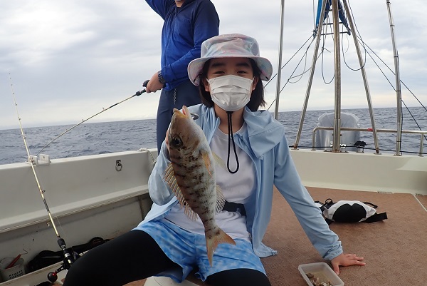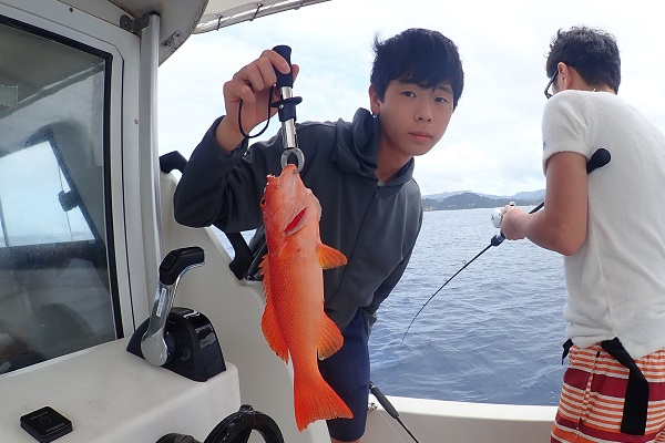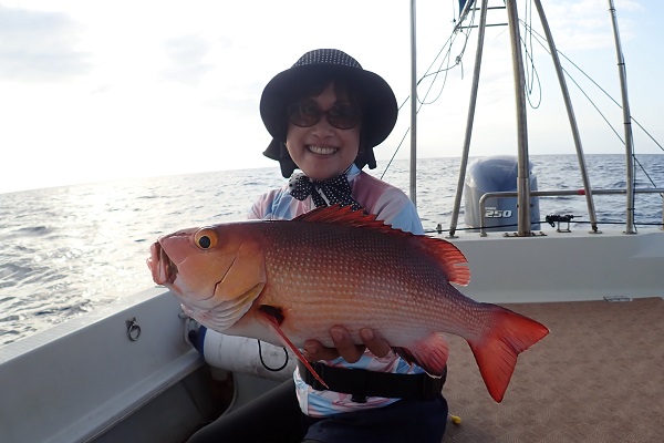 | 午後は満潮からの下げ潮時に出船。午前と同じポイントは波が高く入れないので風裏ポイントまで移動して釣り開始です。 フエダイ・クチナジなどを釣り、食べる分は十分確保。確保してからの、美味しいシロダイ追加!喜んでいたら、 立派なサイズのミミジャー、そしてアカジンまで釣り上げ、美味しいお魚が連発となりました。今日は母の独り勝ちとなりました。 |
