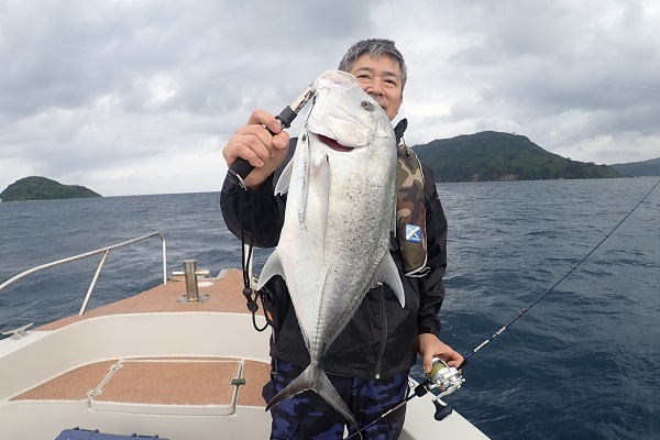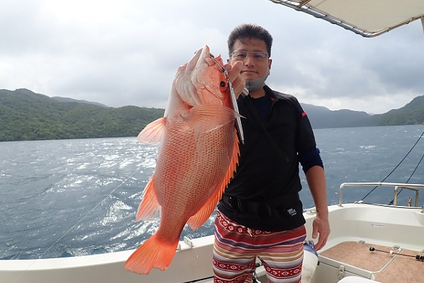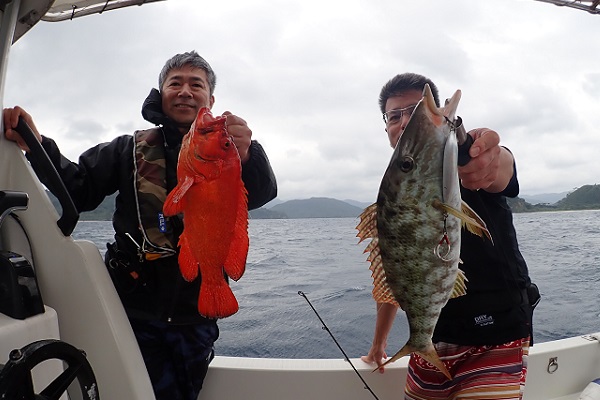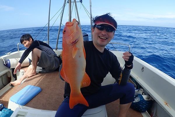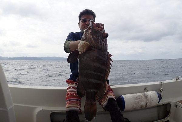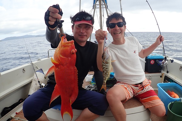 | 2年ぶりに遊びに来て頂いたリピーター様と根魚狙いのジギングへ行って来ました。水深100mからスタートです。 魚探の反応は常にばっちり出ていますが、なかなか口を使わない日。 食ってきてもサイズがでかすぎてラインブレイク連発です。そんな中ようやく上がってきたアカジン。しかし後が続かず水深60mへ。 浅瀬ではミーバイ・フエフキダイなど反応良く釣れました。食べる分は十分確保しましたが切られた数が多すぎて悔しい帰港となりました。 是非またリベンジに来てくださいね。 |