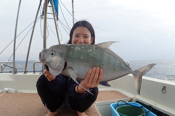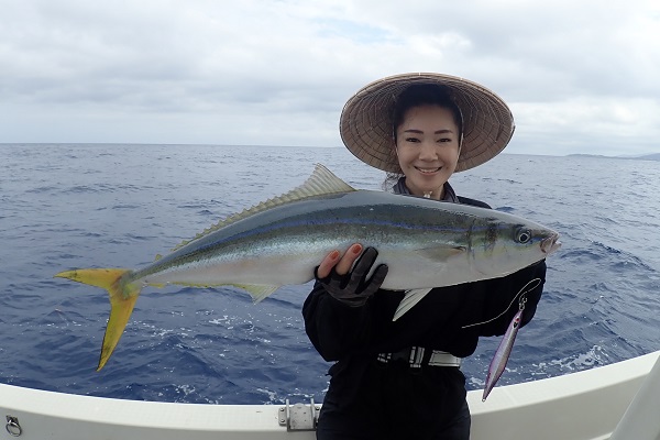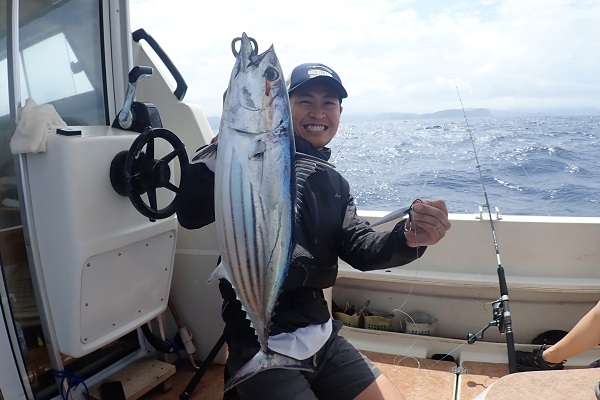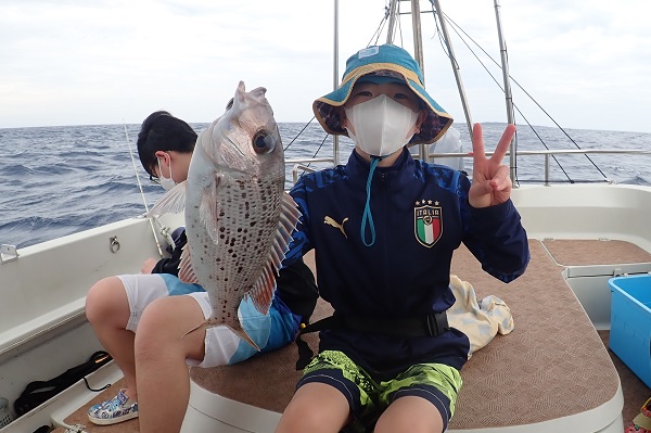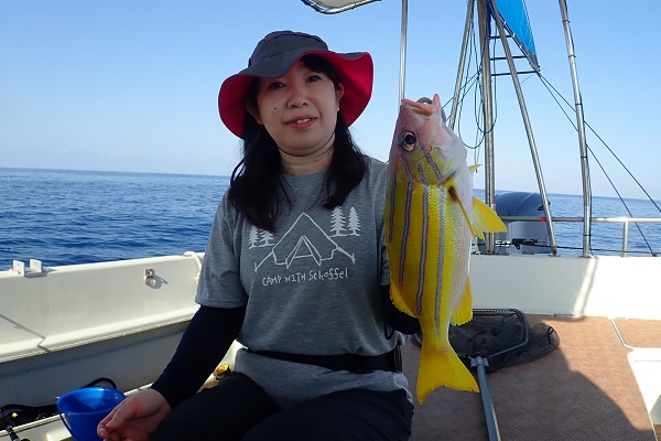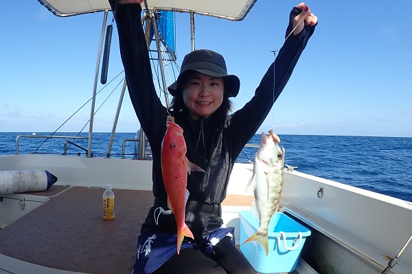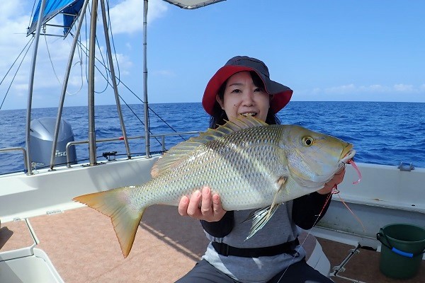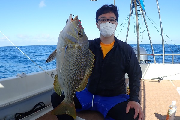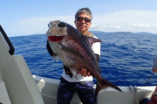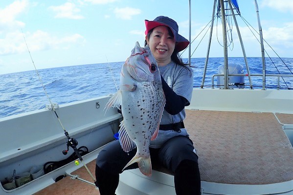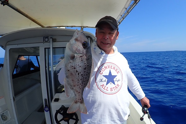 | 今日も波は1.5m、緩い南風と最高のうみ日和です!当店としては珍しく女性アングラー1名様でチャーターしていただきました。 まずは餌釣りから始めて肩慣らしをしていただき、タイラバで沖縄らしい大物狙いです。 水深80mのポイントで餌釣り開始。今日は魚の機嫌も良く、フエダイ・フエフキダイが入れ食いです!その後はタイラバに変えて、 大物は突然やってきます!竿が水面に引き込まれ、巻いてはドラグが出てを繰り返しようやく上がってきたのがメジロザメ・・・サメかぁ・・・。 気を取り直してポイント移動の繰り返し。魚探に反応バリバリなポイントでタイラバ高速巻き。良型のシロダイ・タマンと立て続けにヒットです。 沖縄らしい魚をたくさん釣っていただき、最後はイルカの群れに遭遇。 手首は疲労していましたが完璧なしめとなりました。 |