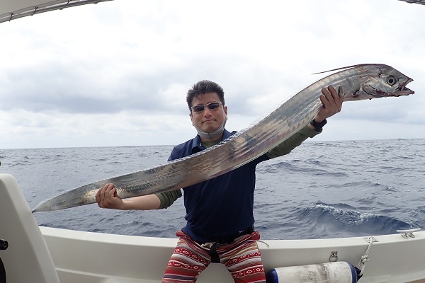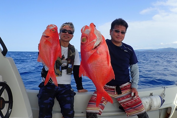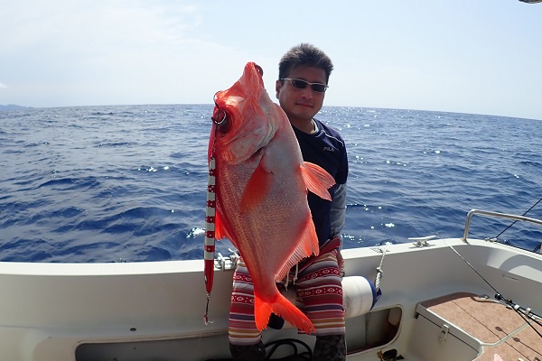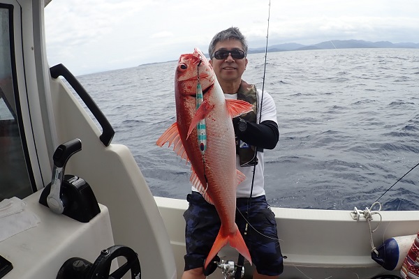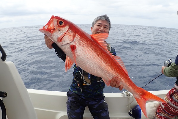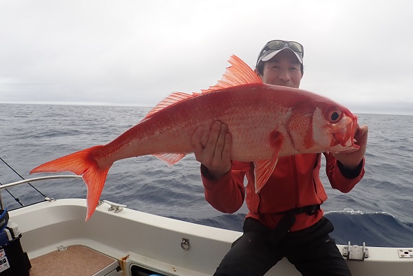 | 常連さん2日目の今日は、波も風も穏やかになり沖へ出て深海ジギングです。まずは水深290〜320mで探ります。 潮止まりから釣りを開始して、潮が動き始めた2時間後!ようやくバイトがあったのはオオクチハマダイです。その後も連発を狙うも撃沈・・。 水深400mや200mとポイントを転々としますが反応はいまいち。 ダメもとで水深500〜550mへキンメ・クロムツ狙い。 1流し1尾釣れる高活性!狙い通りナンヨウキンメやエチオピアを見事釣り上げて頂きました、手巻きで!!終わり良ければ総て良し。 明日はさらに遠出して本命狙いましょうね。 |