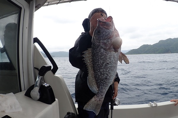 | 午後は波も少し穏やかなになってきたので水深80〜90mでタイラバで大物狙いです。午後も活性は高く、 美味しいお魚のオンパレード!今日はサメの被害が多く大物はことごとく逃がしていましたが、終了直前でドラマがあり、 たまたま釣れた30cm程のオジサン。ジギングタックル PE2号・リーダー40lbのアシストフックに掛け、アカジンポイントで落としてみたら強烈なバイト!!走り方的にサメではないと判断してフルドラグでファイト。上げてびっくりのコクハンアラでした。 |