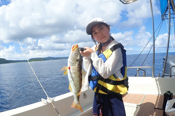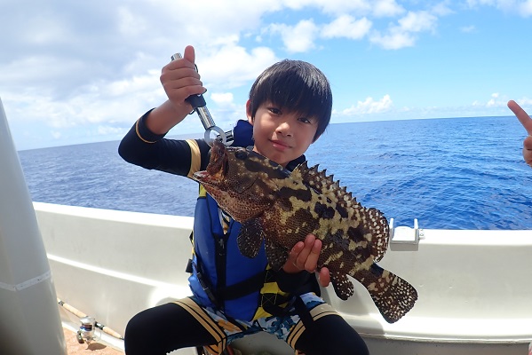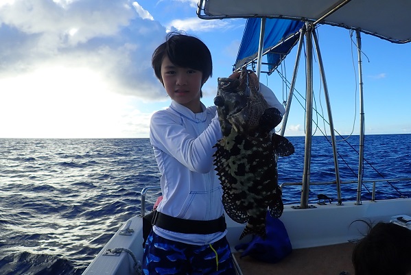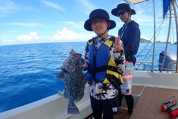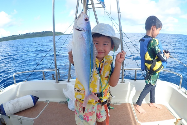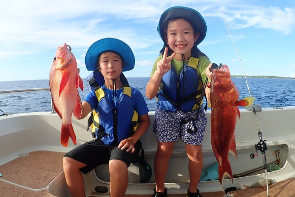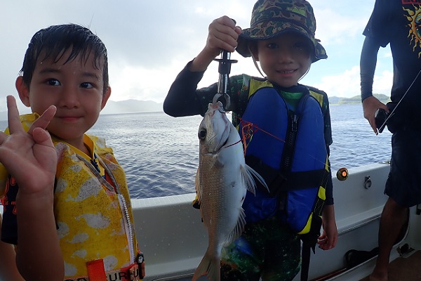 | 今日のサンセットは久し振りの乗り合いで出船です。波も静かなので、少し沖のポイントで釣りをしてきました。 ナンヨウカイワリの群れにあたったのかダブルヒット!太ってて美味しそうな個体でした。その後も好調で、 ミミジャーやアズキハタなど大きな魚がたくさん釣れました。 引きも強い中、子供達はみんな頑張ってリールを巻いてくれました。 |