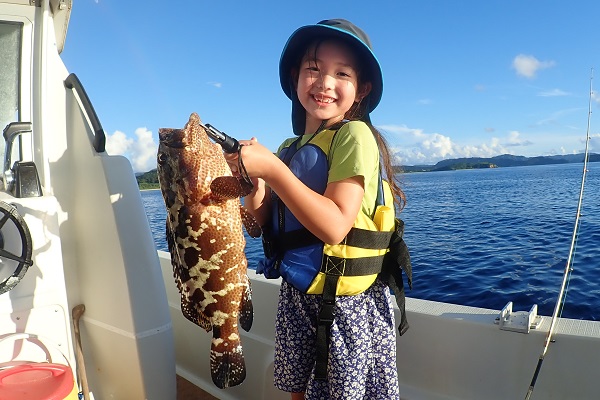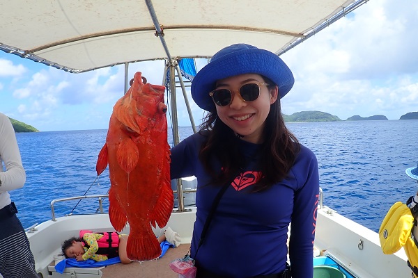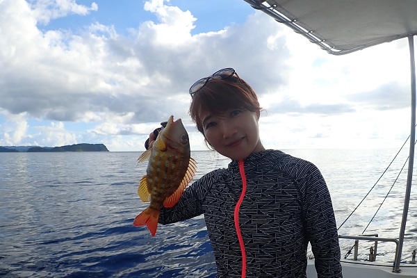 | 午後からは毎年恒例、島の友達のお姉さん家族達です。 魚の切り身とミジュン1匹掛けで数・大物共に狙ってみましたが、ミジュンの威力恐るべし!面白いように良いサイズのハタだ釣れます。 ハタ以外にもオジサンやフエフキダイなどたくさん釣れましたが、残念がら大物ブレイクがありました。来年こそは逃がした魚獲りましょう! |