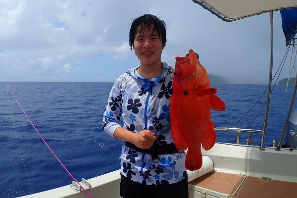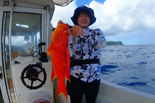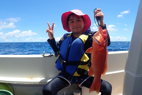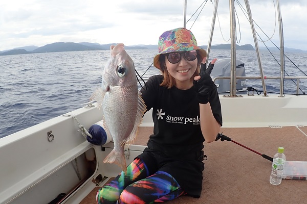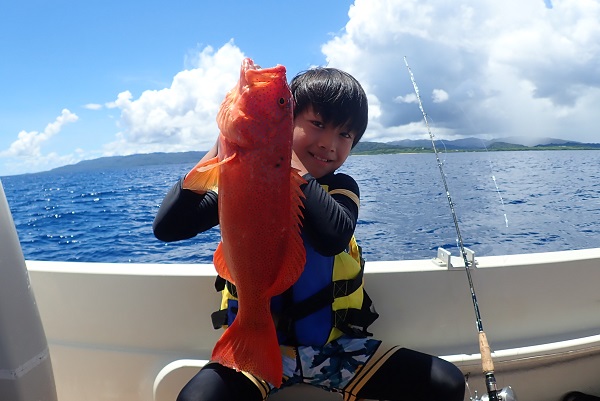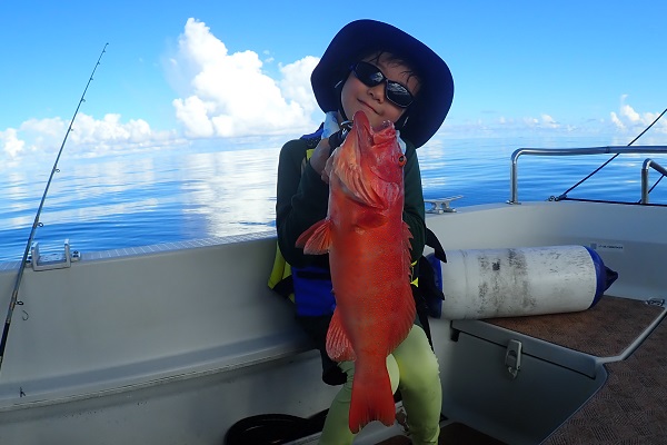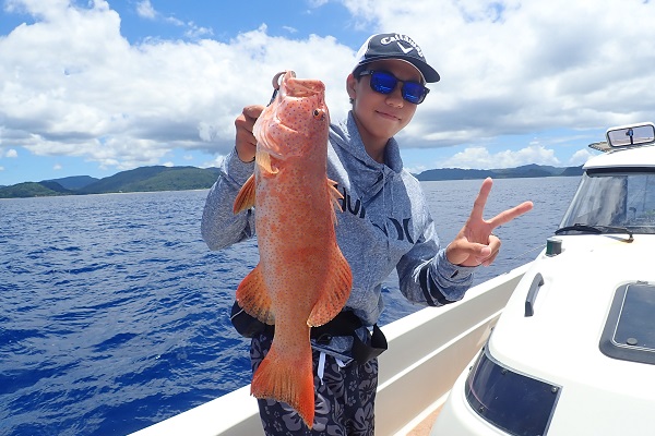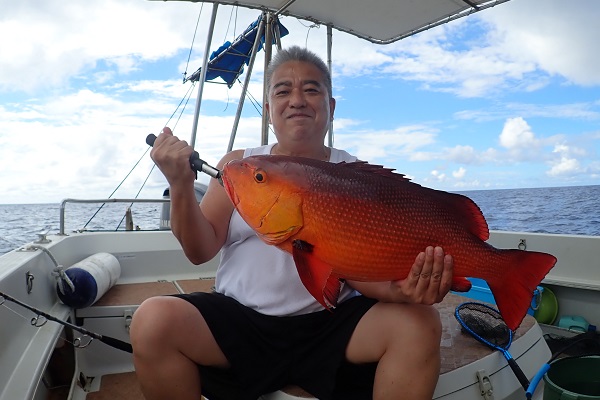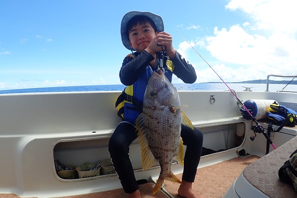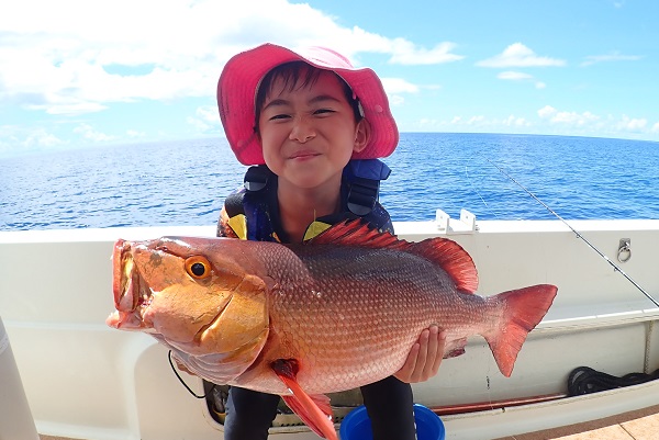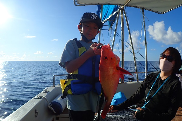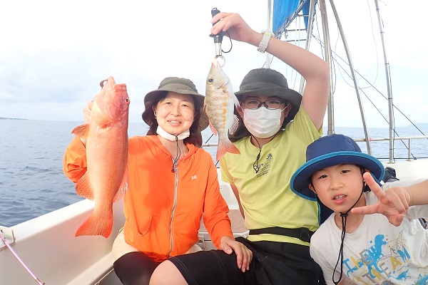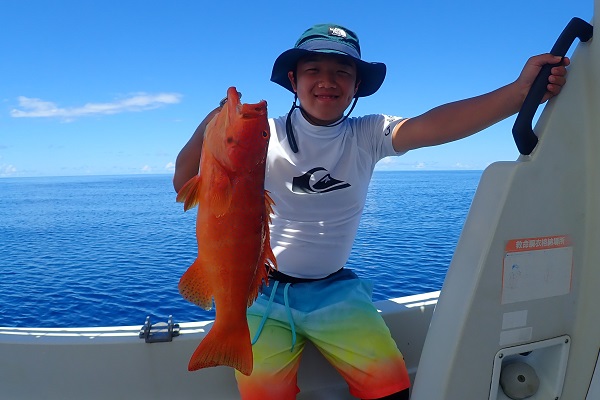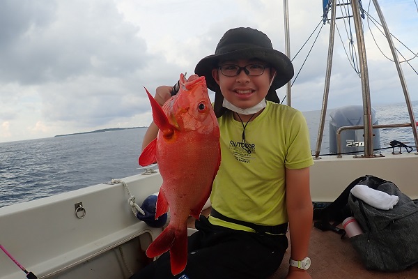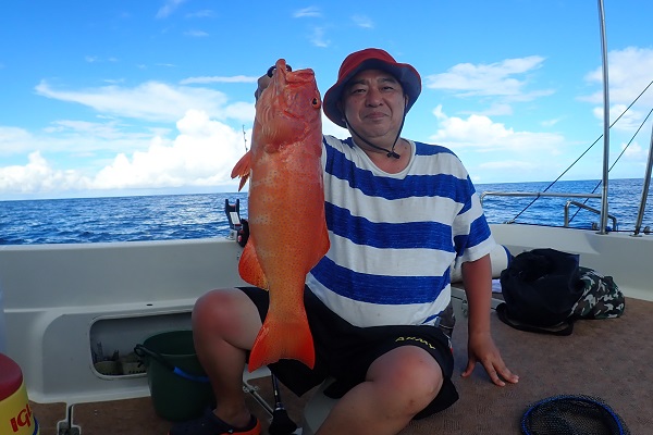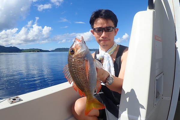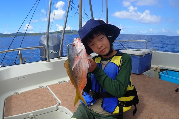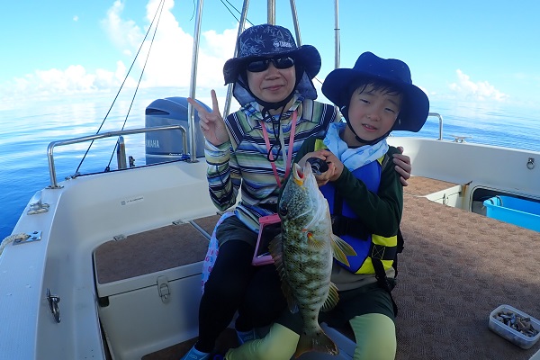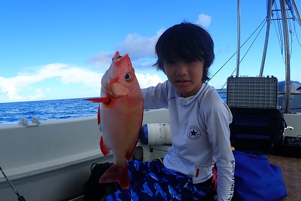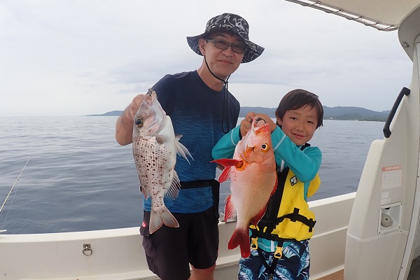 | 8月に入り良い海況が続いています。今日もベタ凪・快晴です。 本日のゲストhs船釣り初挑戦の親子。水深40mで餌釣りしてきました。 開始1投目にして、40cm程の小さなアカジン。まだ小さいのでリリースをして2投目、50cmのアカジンになって帰ってきました。 その後もムネアカやクチナジ、イシフエダイなど良型の魚ばかりが釣れ、最後にユメウメイロを最初から最後まで一人でキャッチ。 子供の成長を感じた日でした。美味しく食べてくださいね。 |