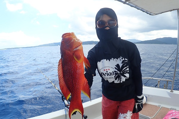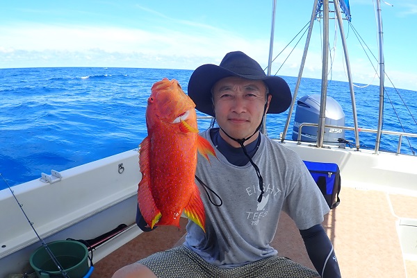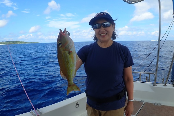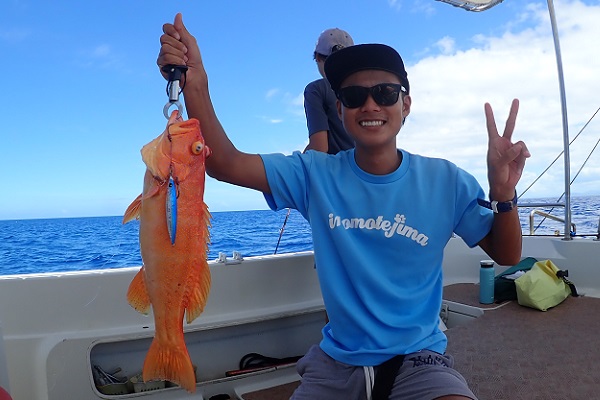 | 今日はここ最近で一番風が強い西表島です。ジギングと餌釣りで大物狙いで出船です。 ジギングのレクチャー直後、PE1.5号タックルに強烈なバイトから上がってきたのは久し振りに良型のアカジンでした。その後更に大物バイトありましたが残念ながらブレイク。 釣り開始1時間が今日の時合だったみたいで、徐々にアタリも減り大苦戦の1日となりました。是非またリベンジさせて下さい。 |