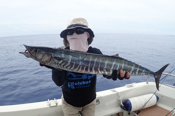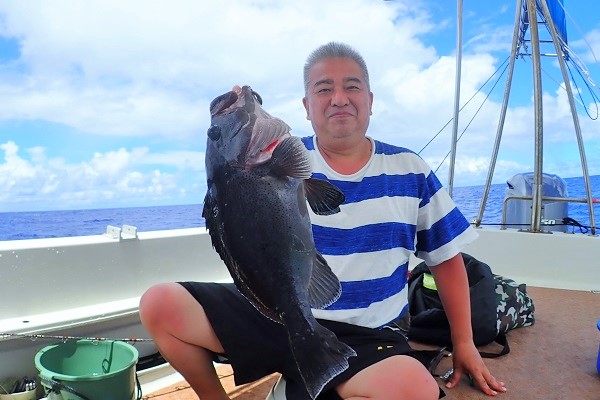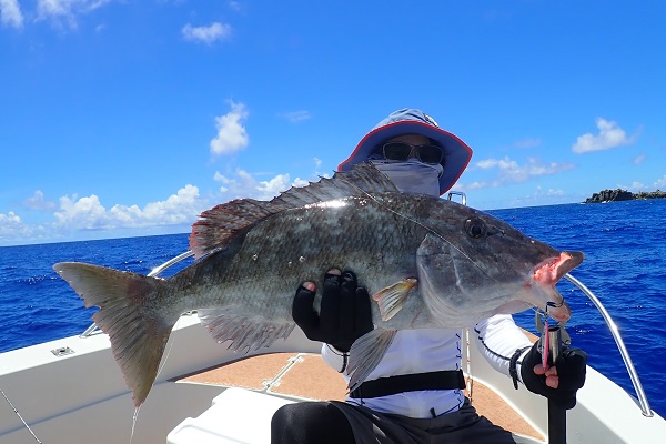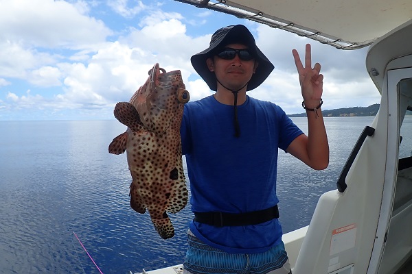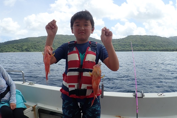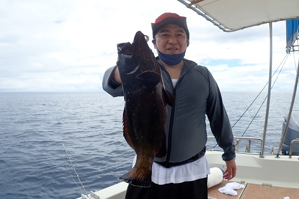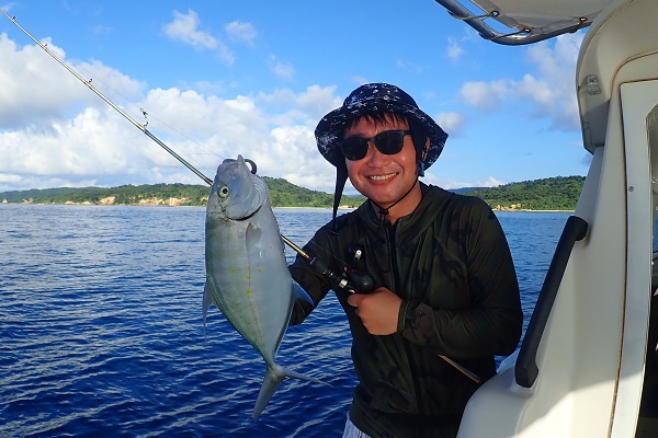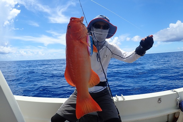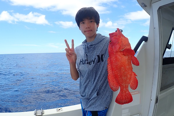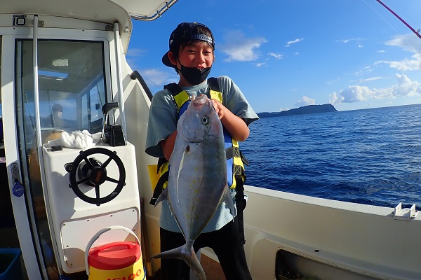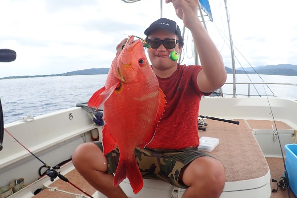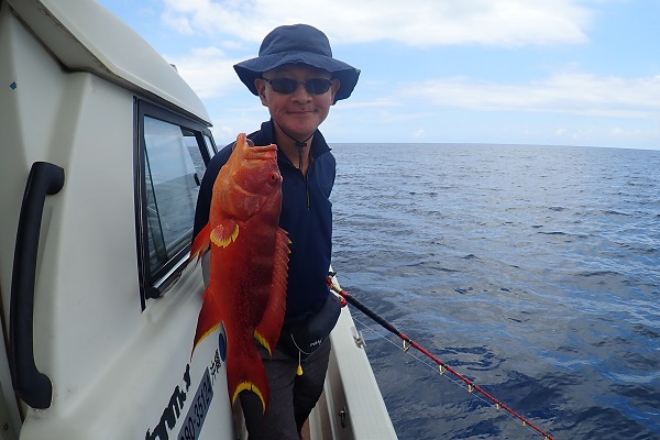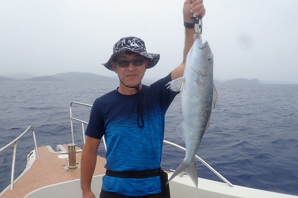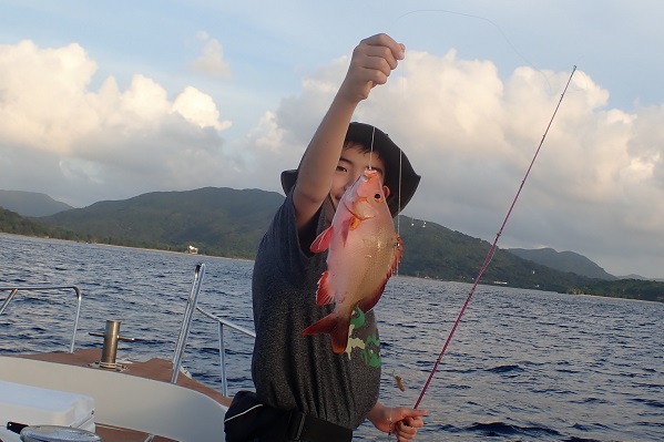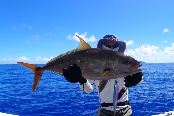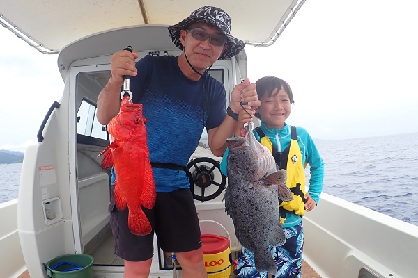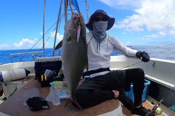 | 常連さん最終日。今日は息子も参戦!餌釣りとジギングで美味しい魚を釣りに行って来ました。 釣り開始時は魚の活性が悪く、アタリも少なく苦戦しましたが潮が満ち潮になり徐々に活性も高くなり、 餌釣りでミミジャーやアカジンを見事キャッチ!ドラグが出る程の引きでしたが一人で頑張って釣り上げました。お父さんは、 ライトジギングでヒレナガカンパチやアカジンを危なげなくゲット! 午後はアタリも多く、ジギングでも数釣りが出来る程の高活性。 2時過ぎには雷雲が近づいてきたので少し早上がり。安全第一です! 今回は5日間、ありがとうございました。課題が残る釣行となりましたがまた10月お待ちしております! |
