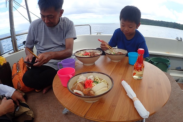 | 今日は船釣り初挑戦のご家族と網取まで行き釣り&シュノーケルツアーです。外離れ沖は潮の流れが早く断念して、ヨナ曽根でミミジャー狙いです。 群れが小さく、ピンポイントで仕掛けを落とさないと釣れない今日のミミジャー。思ったよりも数が釣れ、思ったよりも魚の引きが強くかなり楽しめたみたいです。そしてお昼ご飯は、 釣れたてオジサンとヨスジフエダイ入りのソーキそば。海で食べるそばはとっても美味いんです!! 午後はシュノーケリング。潮の流れがありましたが、透明度も良く綺麗な水中を楽しめました。聞いてはいましたがサンゴの白化がかなり進行していました。今すぐにでも台風が来て海をかき混ぜて欲しいですね。 最後に、水面から見る自分の船。格好良いです!! |