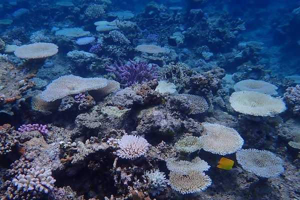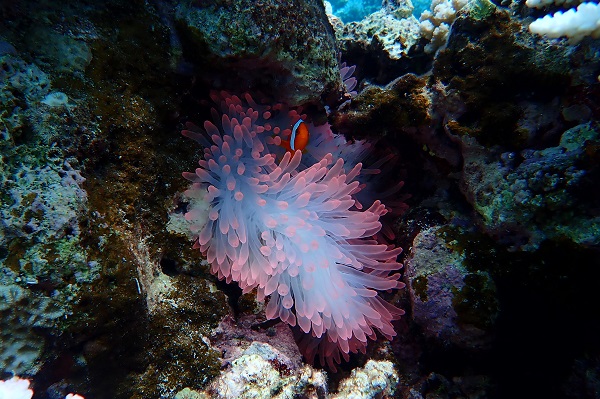 | 今日もベタ凪・無風の西表島です。台風の雰囲気ゼロです!! 今日は午前中に餌釣り・午後はシュノーケルをしてきました。 枝状ミドリイシも少し色が抜けて綺麗な青や紫いろになっていましたが、イドギンチャクは色が抜けてピンク色に・・。 他のサンゴも色な抜けて水中は真っ白になってきました。しかし今日は透明度も良くとっても気持ちの良い水中。上がった後はバケツをひっくり返した様な大雨でした。 |