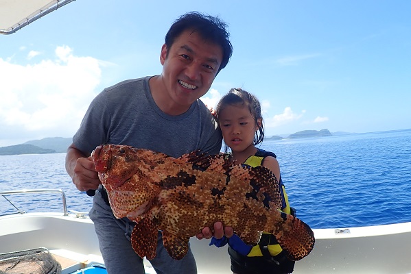 | 今日のサンセットはイギリスから一時帰国のご家族です。沖縄らしい綺麗な魚・美味しい魚を狙ってきました。 魚の活性は徐々に良くなり最終的にはミミジャーが連発!フエフキダイは何匹逃がしたことか!そして食事には、刺身・煮付け・唐揚げと和食で堪能。是非また遊びに来てくださいね〜 |