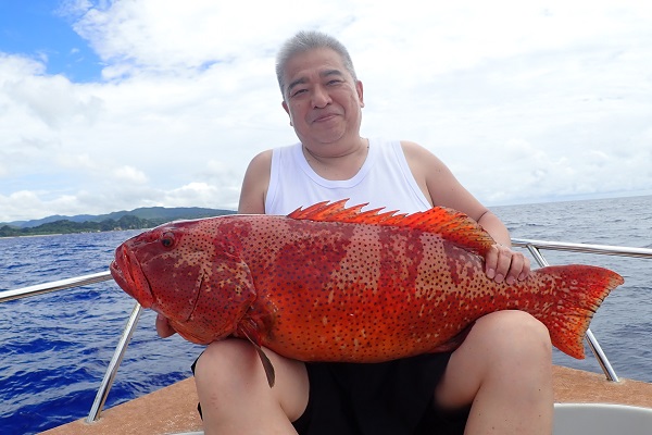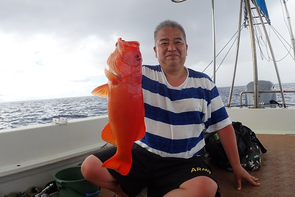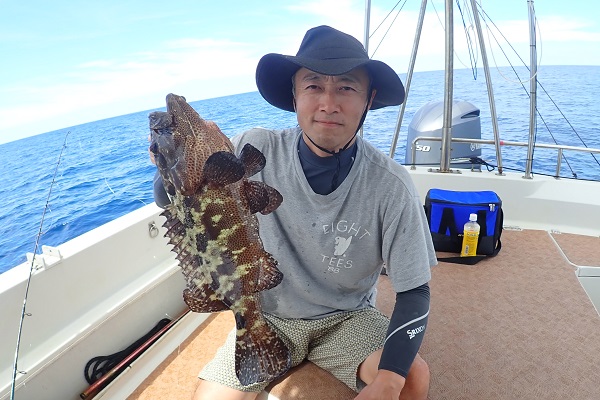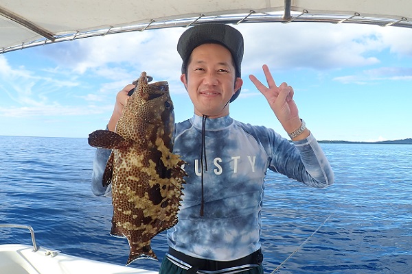 | 今日は毎年遊びに来てくれる常連さんと初めての泳がせ釣りへ行って来ました。餌となるグルクンも順調に釣れ、水深30〜70mで大物狙い! 本日のファーストフィッシュはバラハタでした。引きはそこまで強くないのですが、アタリの出方は派手な魚です。その後も、 サメのバイトも多数ありましたが、良型ムネアカクチビやマダラハタなど、お刺身サイズを無事に確保となりました。 |