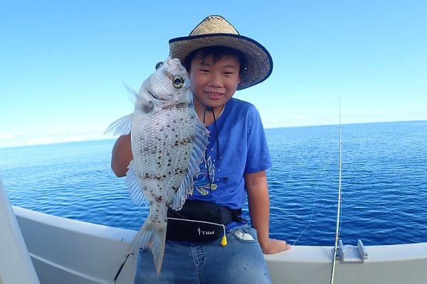 | 天気予報は風も強く、雨予報。でも実際海に出てみれば、風も緩く凪な1日です。今日のゲストは去年から遊びに来て頂いているリピーター様。 去年よりサイズアップを狙い、餌&タイラバで大物を狙って来ました。 まずは浅瀬で餌釣りの復習。と思っていたら良型ミミジャーの群れにあたり、仕掛けを落とせば次々にミミジャーが釣れます! ミミジャーと一緒にシロダイやウメイロモドキも混じり、夕食食材は無事に確保。おそらく20匹は釣れたでしょうか!?その後はタイラバへ。 開始早々強烈なバイトから上がってきたのはアオチビキです。背中には何者かの噛み跡が!ポイントの移動を繰り返し、 アザハタとツチホゼリのダブルヒット!今日の勝負は美味しいツチホゼリを釣り上げた子供の勝利かな!?無事にリベンジを果たした1日でした。来年もサイズアップ狙って行きましょうね!! |