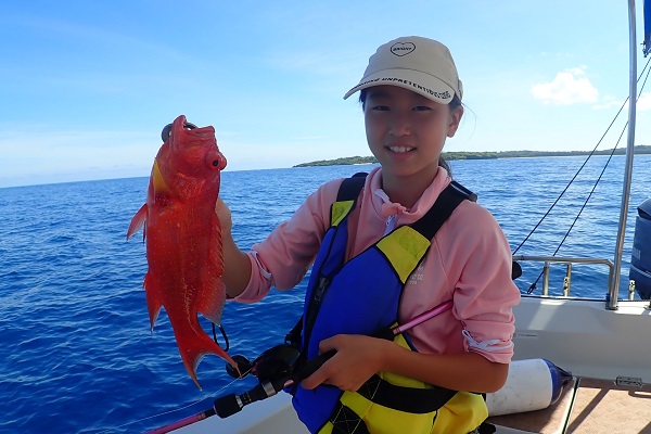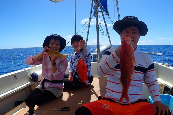 | 今日も凪の日が続いています!本日のゲストは約3年ぶりに遊びに来て頂いたリピーターご家族です。餌釣りとタイラバで美味しい魚を探してきました。 まずは浅瀬の餌釣り。活性が少し悪く、アタリの数は少なかったですが、 ミミジャーやムネアカの良型を見事ゲットです。餌釣りを早々に切り上げて少し深場でタイラバスタート!! 干潮潮止まりまではアタリはゼロでしたが、満ち潮に変わり徐々にアタリの数が増え、アカジンやアザハタなどをキャッチ。最後の最後には大物がヒットするも残念がらアシストラインからブレイク。少し悔しい終わり方でしたが、食べる分は十分に確保!リベンジに来てくださいね〜 |