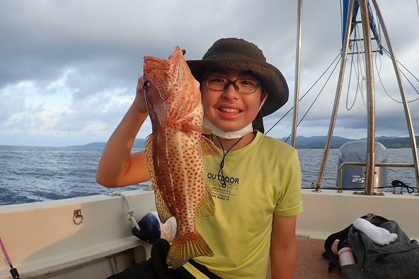 | 早朝出船、お昼過ぎに帰港して一休憩後、サンセットチャーターで美味しい魚を狙ってきました。 母、無欲の勝利です!1投目にしてアカジン、おめでとうございます。 その後も良型ミミジャーやアズキハタなど、美味しいお魚たっぷり釣れました。美味しい夕食を堪能して下さいね〜 |