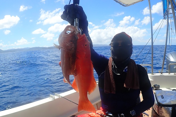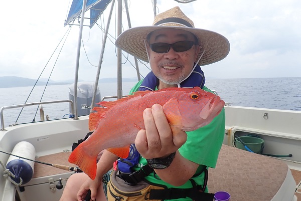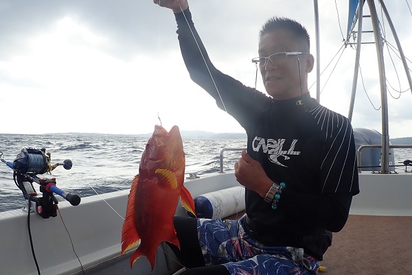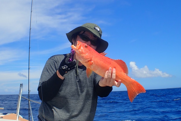 | 昨日に引き続き深海ジギング2日目です。波も穏やかになり、気合いを入れて早朝出船の深海ジギングです。 ポイント到着後数回流してようやくスマが食い付いてきました。 本命の深海ジギングはと言うと、根掛かりして高切れで試合終了となってしまいました。残りの時間は水深80〜200mのポイントを転々としましたが、水深80〜90mの活性が良く、 バラハタ・アカジン・アザハタと赤いハタが連発となりました。 本命のカンパチもこの日はノーバイト。リベンジ釣行お待ちしてます。 |
