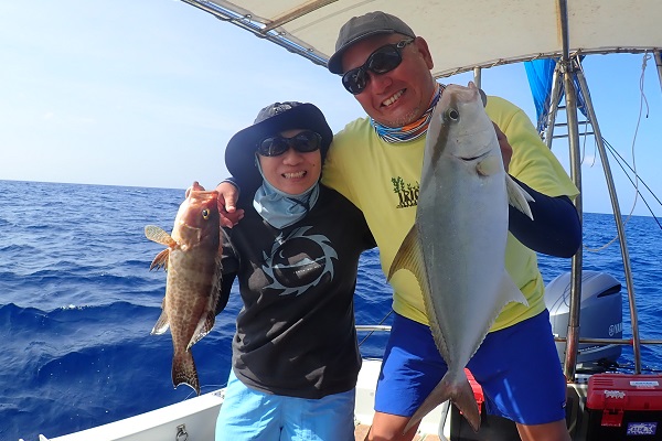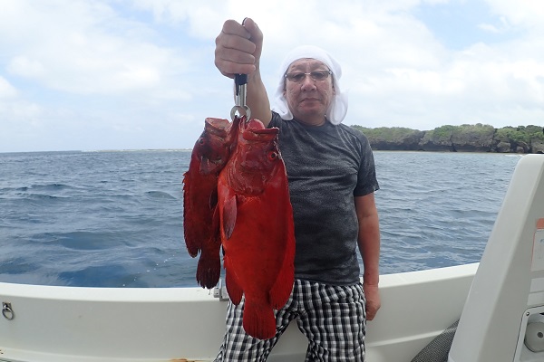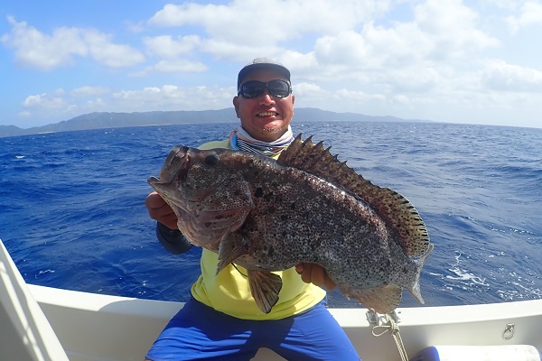 | のろのろ台風12号も無事に通り過ぎ、今日からツアー開始です。 開始最初の釣りはグルクン泳がせ釣り。ルアーメーカー スカジットデザインズ 皆川さんと共にうねりが残る中出船してきました。 潮の流れが早く釣りにくい状況でしたが、魚の活性はMAX!まずは小型アカジンを釣り上げ、 コクハンアラ3連発!!!仕掛けを下に落とせばすぐに反応が出る日、 釣り人でも船長でもなく、海が凄かったです!泳がせ釣り1時間半で十分な量になったため、今日は嬉しい早上がりとなりました。 |