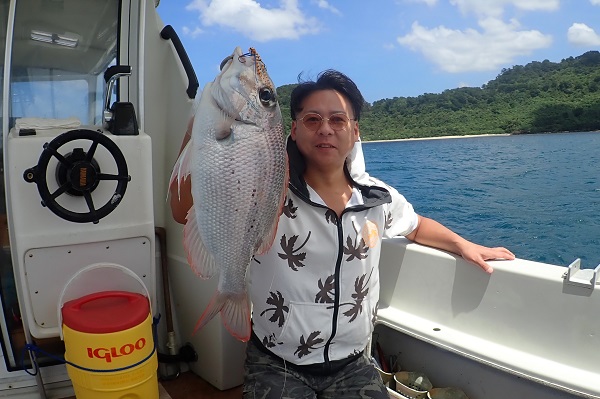 | 一昨日乗船していただいた常連様が再び遊びに来てくれました。前回入れ食いだったグルクンも生簀で活かしてあったので朝一から泳がせ釣りスタートです。 開始時が時合だったのか?道具の使い方・動作等説明中もアタリが連発でした。上がってきたのは残念ながらバラハタでした。 その後は食いが止まり、ポイント移動の繰り返し。 よーやく大本命の良型アカジンをキャッチ!お見事でした〜 最後は岸近くの浅瀬ポイント。サメと間違える程の良い引きを見せてくれたのは6kg超えのアオチビキでした。また近いうち遊びに来てくださいね〜 |