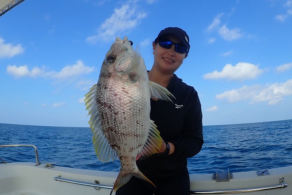 | 今日は石垣島から日帰りでツアーへご参加のお客様。船の時間の関係で半日よりも更に短い時間で餌釣りで大物を狙って来ました。 フエフキダイやカワハギなどを数釣りしているとドラグを出す大物がヒット!巻いては出されての繰り返しでしたが、良型サザナミダイを見事キャッチ!その後はハタ狙い、ミミジャー狙いなどポイントを転々として 予想外の大物、アオチビキが切り身にヒット!ハリス6号で上手に釣り上げていただきました。お土産たっぷりで帰港となりました〜 |
