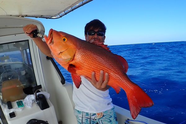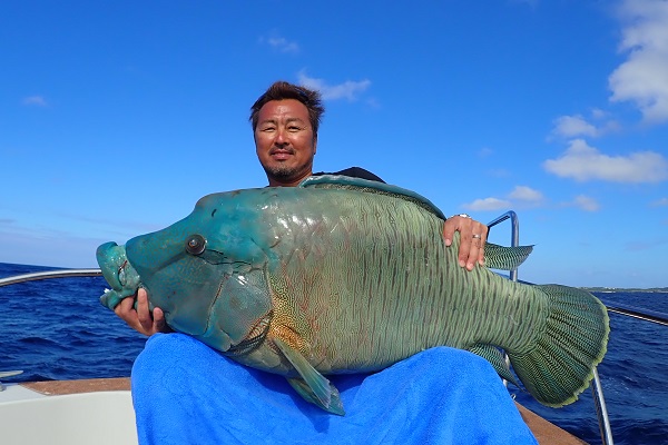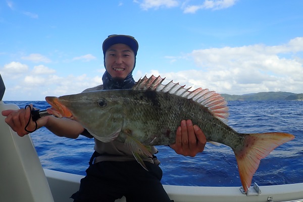 | 今日も波1.5mの予報ですが、思ったよりも風・波がある西表島です。 今日は朝からグルクン釣り。2時間で20匹程確保して、沖の100mラインでカンパチ・巨ハタ狙いです。ポイント到着後1流し目。良いサイズの魚がヒットしましたが残り40mでサメの餌食に・・・。その後はサメのバイトが多く80〜60mまで実績ポイントを転々として、 3kg超えのアカジンがダブルヒットや今日も良型アカナーが釣れました。生餌残り2匹のラスト流し、オジサン餌にて 最後の最後にナポレオンフィッシュ ♂を見事キャッチとなりました。 毎年持ってる人には敵いませんね〜。今年もありがとうございました。 |