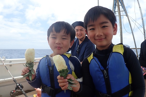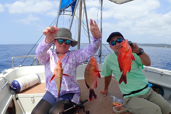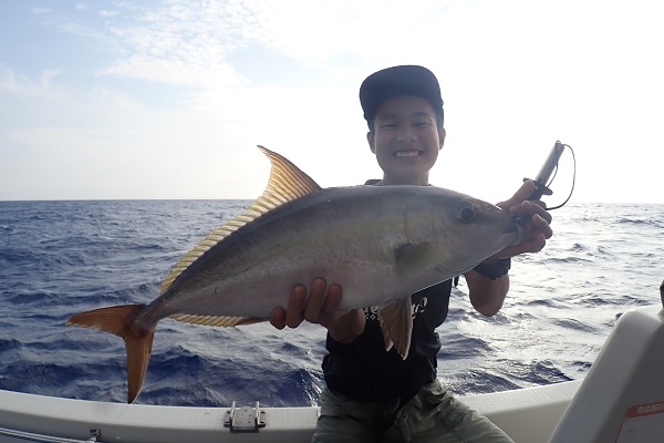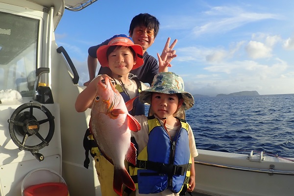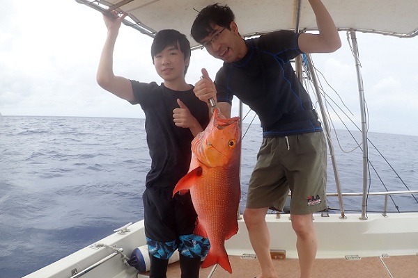 | 西表島はすでに初夏の陽気です!今日のゲストは数年前に遊びに来て頂いたご家族。あの頃は小学生で可愛らしい子供でしたが、今では中学生。身長も伸び、声も変わりすっかりお兄さんになっていました。 餌釣りでフエフキダイなどを釣り、大物を狙って沖へ出て鯛ラバ開始。 ファーストヒットから大物で残念ながらラインブレイク。その後はサメに邪魔されたりと思う様な釣果にはなりませんでしたが、高級魚のアカジンをしっかりキャッチ!!次回は泳がせ釣りでさらに大きな魚を釣りましょうね。 |