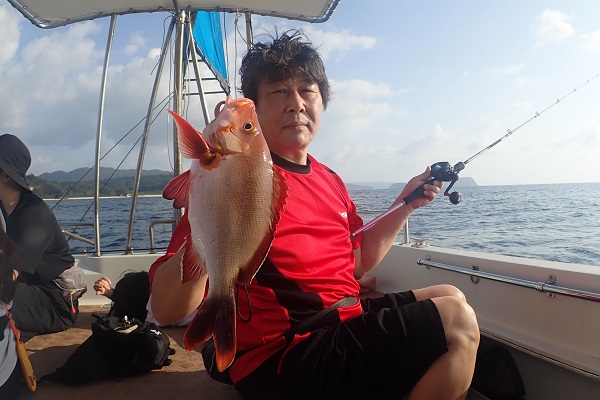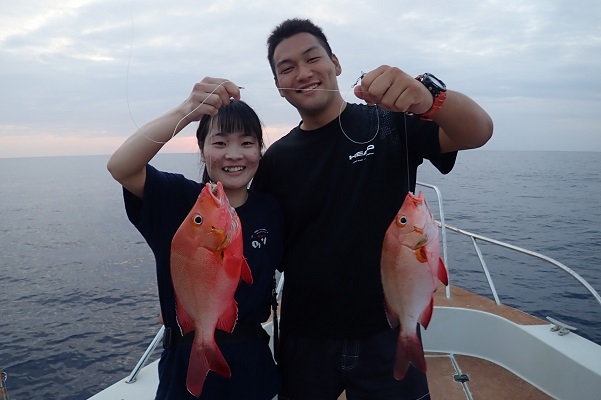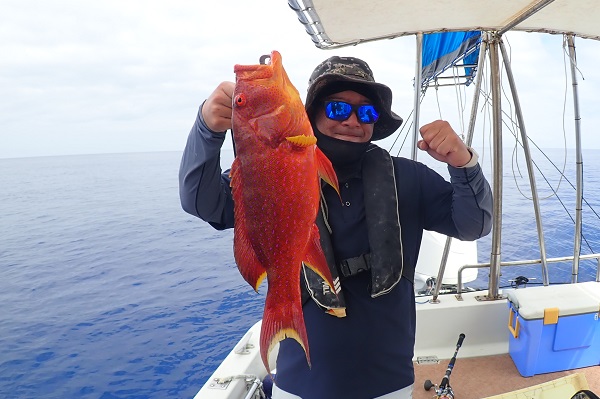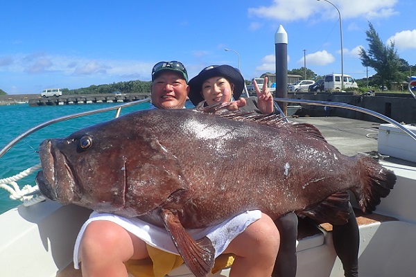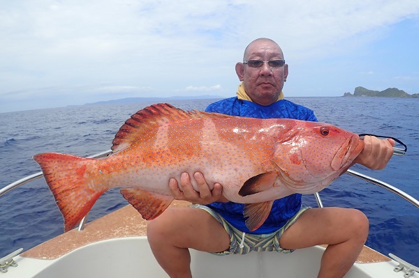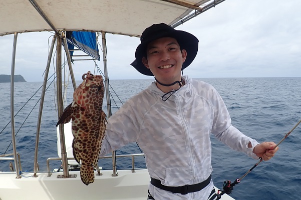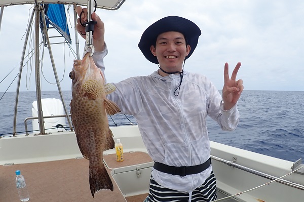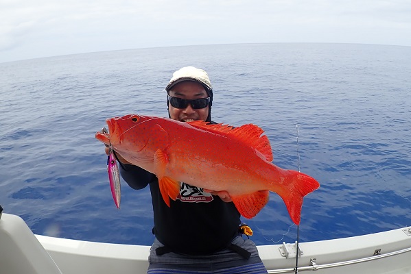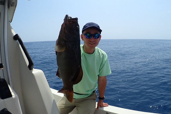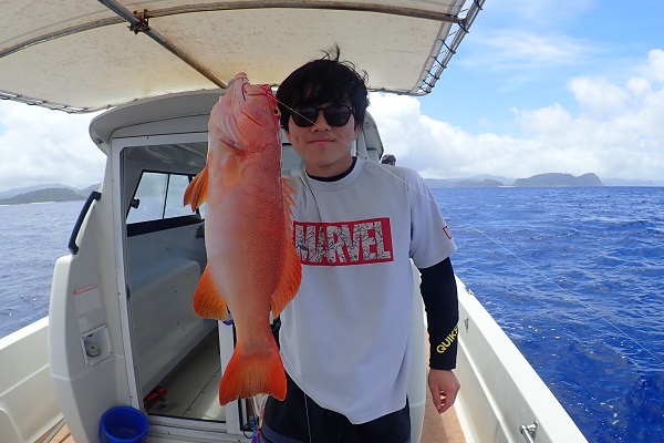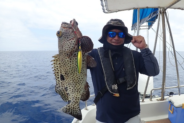| 今日のゲストは沖縄本島から橋の点検へ来ている業者さん達。しっかりと釣り竿持参で気合いたっぷりアカジン狙いで出船です。 ジギング初挑戦でしたが、ファーストフィッシュを見事キャッチ!!その後も、 メタボスイマーで良型ハタを連発となりました。 風もなく、潮の流れも緩く厳しい状況でしたが美味しいお土産が釣れて良かったです。次回は出張ではなく、プライベートで待ってます! |