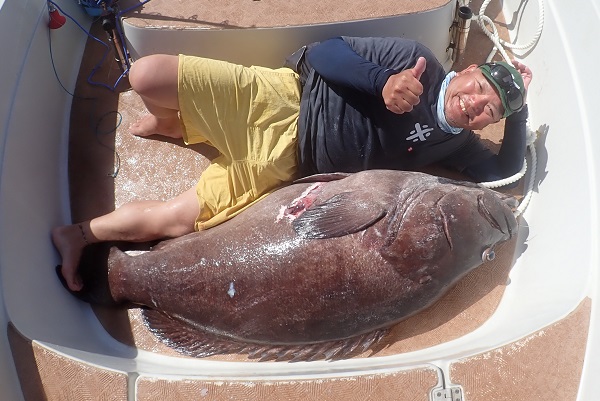| 3日前にもご乗船して頂いた愉快な仲間と怪物狩りリベンジへ行って来ました。今日は気合いを入れて早朝出船!餌は前日の夕方にしっかり確保していたのでポイントへ一直線です。 朝の1投目から巨大なアタリがありましたが何も出来ずにラインブレイク。その後も3回程良いアタリがありましたがやはり獲れない魚。今日はもう食ってこないかなと諦めていた時にラストチャンスのバイト。 船で出来るフォローを入れて残り10mから魚の重みが無くなり、巨大な泡と一緒に浮上してきたカスリハタ!獲りたくても獲れなかったモンスターを見事キャッチとなりました。居るのは分かっていましたが、ここまで大きい個体とは思いませんでした。おめでとうございます。 |