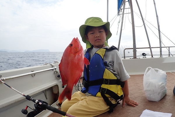 | 今日は久し振りに子供とのんびり体験フィッシンングへいってきました。 魚の活性良くニジハタ・キツネウオ・フエフキダイなど待つ暇なくアタリが続きます。今日一番の引きはフエフキダイのダブルヒット!ダブルピースもいただきました。次回はお姉ちゃんも連れて遊びに来てくださいね! |