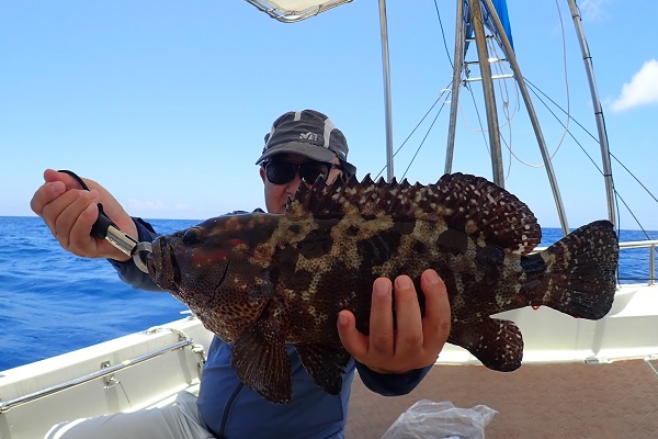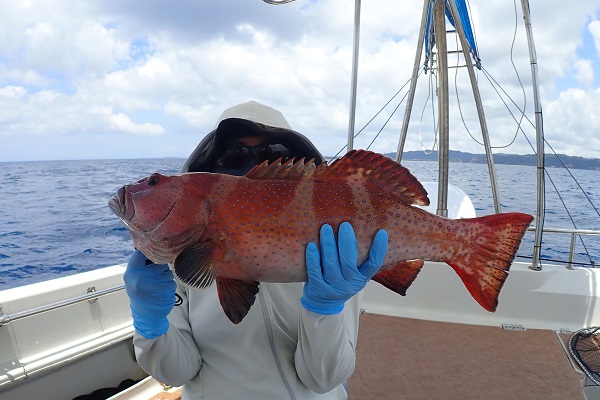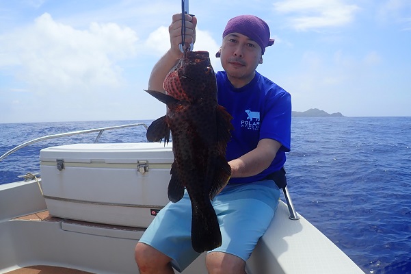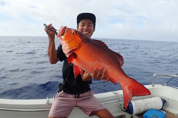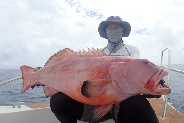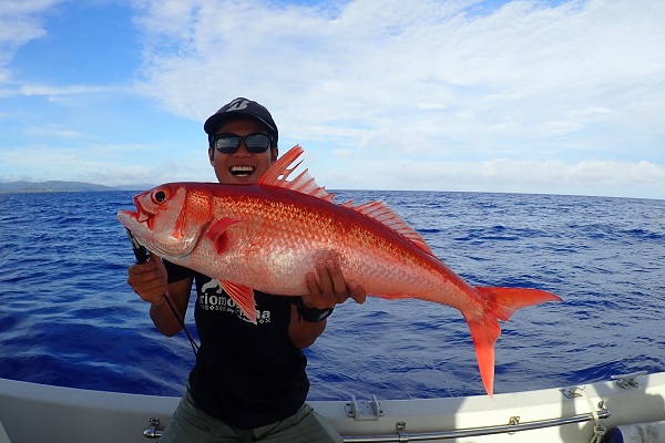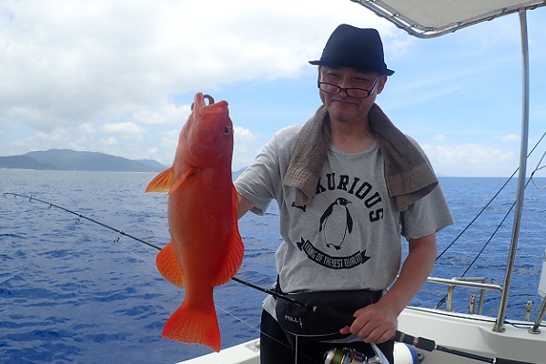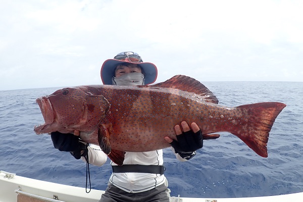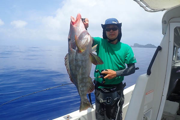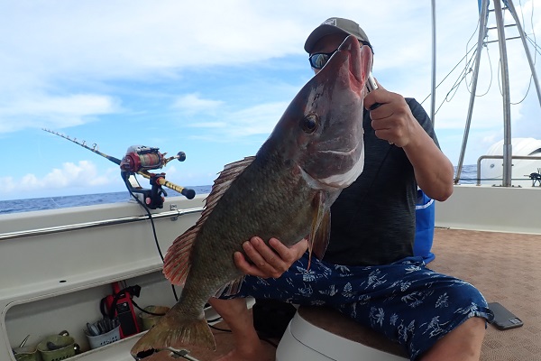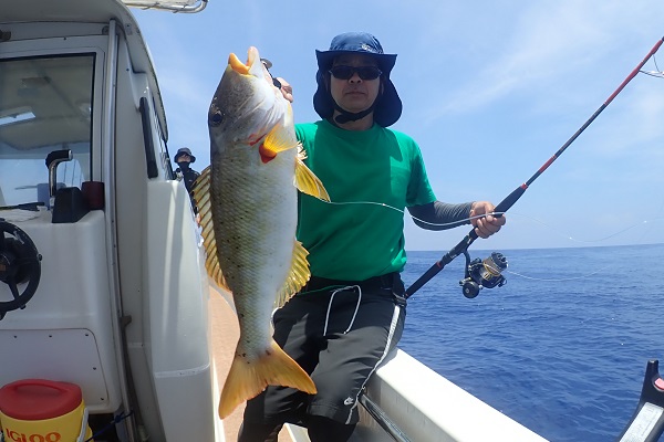 | 梅雨明け後のカーチバイらしく南西の風が強い西表島です。 今日は泳がせ釣り初挑戦のお客様と特注した泳がせロッドを使いアカジン狙いです。潮の流れもほど良くあり、魚っ気あります!! アタリも多く初挑戦にはもってこいの日。色々なバラシを経験してまずはイソマグロが釣れました。その後もアタリが続き、 活性マックスの時合で底取り直後に食い付いてきたコクハンアラ。 掛けた場所が底付近の為、一度は根に入られましたがなんとか引っ張り出すことに成功!初挑戦で8kgの立派な個体をキャッチです!! |