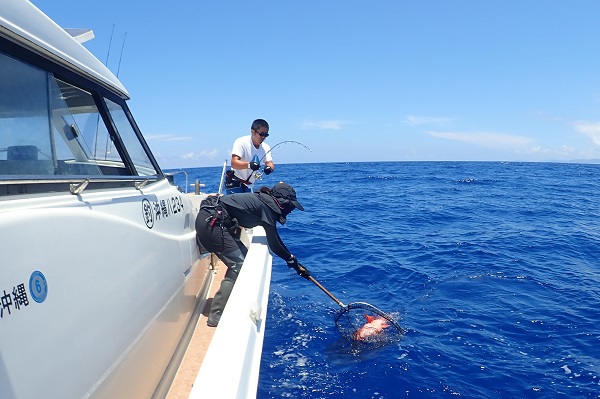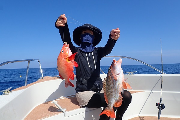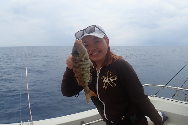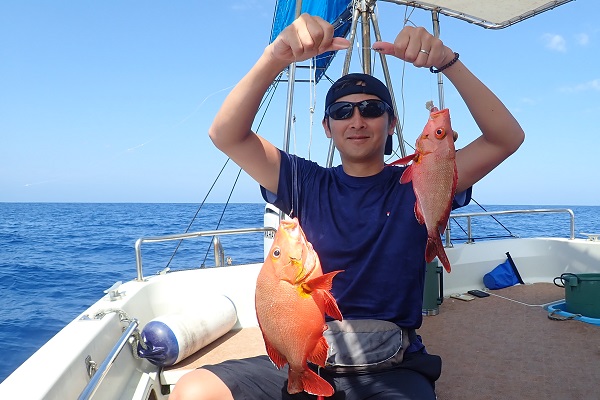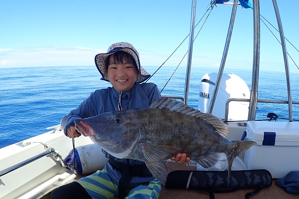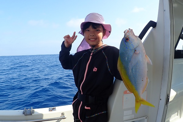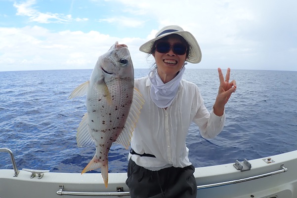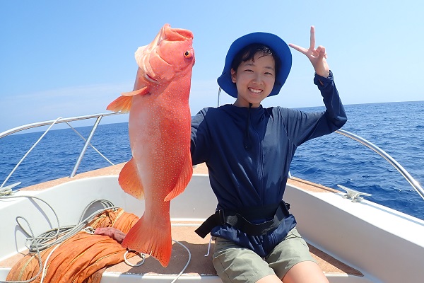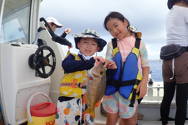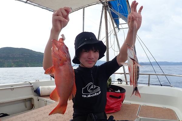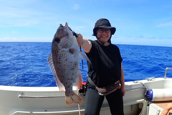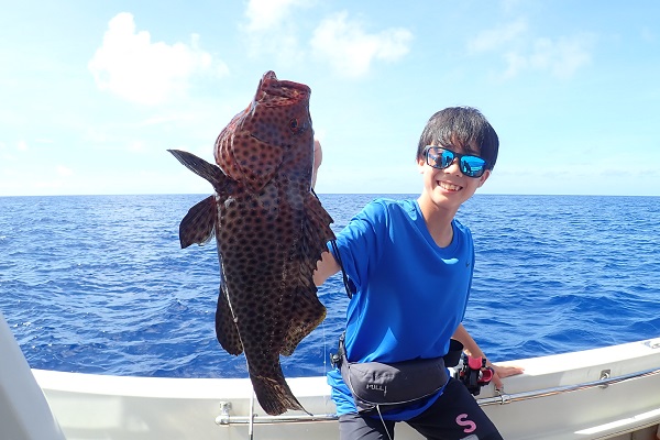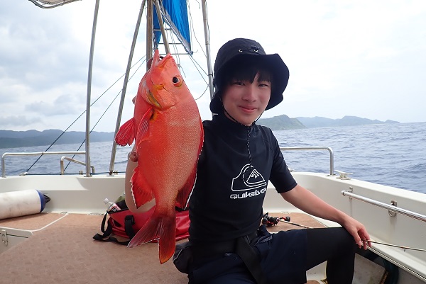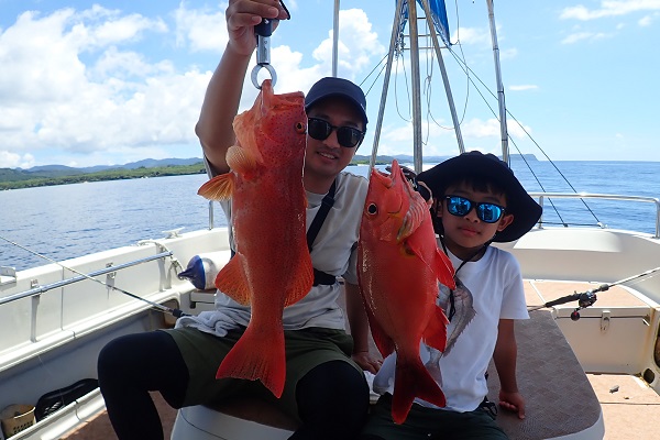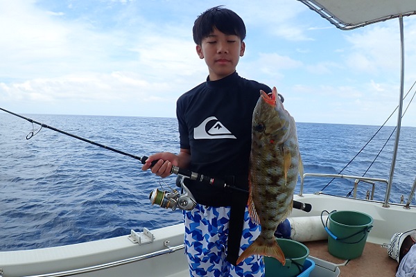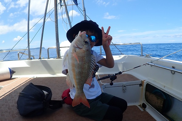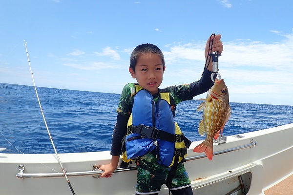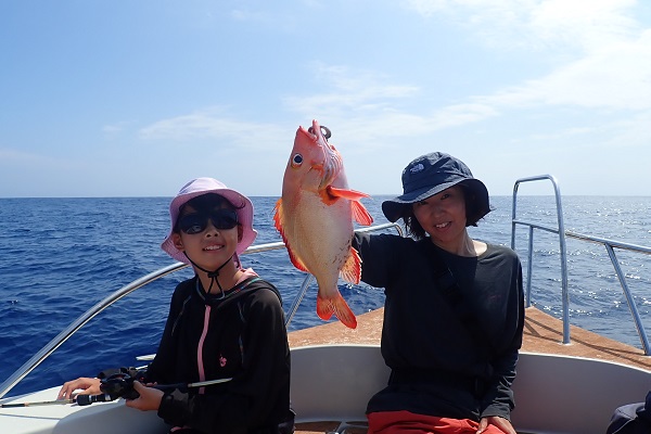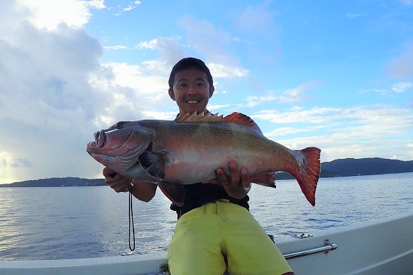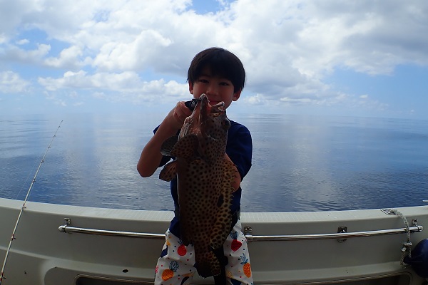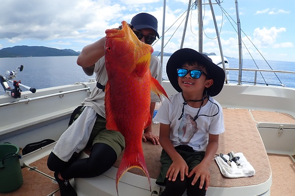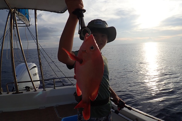 | 台風6号の影響により日程を変更をして遊びに来てくれたリピーターご家族。今回はベタ凪のベストコンディションをご案内させていただきました。 サメに終始ビビっていたお兄ちゃん。開始1投目から良型のバラハタを見事キャッチ!そして、事件が発生!! 去年の釣りはずっと寝ていた末っ子娘さん。今回はやる気満々でご参加。 小さな魚を掛けてゆっくりと巻いていると強烈な引きにチェンジ。ドラグが出されますが、底から少し上げていたのもあり、立派なアカジンを釣り上げちゃいました。今月1番綺麗で立派な個体。 残り時間もわずかになってきた頃、オジサンを餌に泳がせ釣りへ変更。 初めての泳がせ釣りでしたが、6kgのコクハンアラを1投目でキャッチ! 持っている人には敵わない、この釣り方。引き運たぷりのお父さんでした。 |