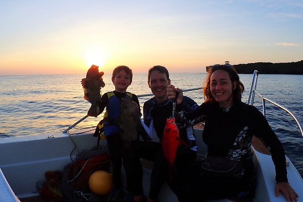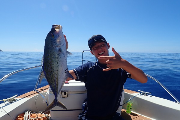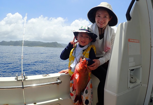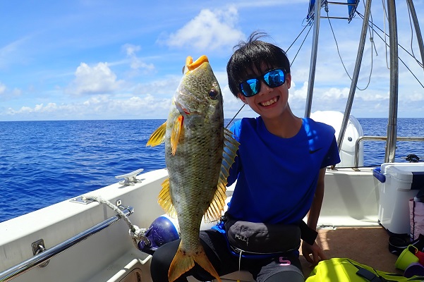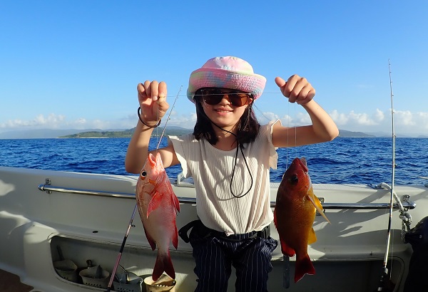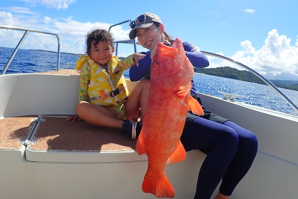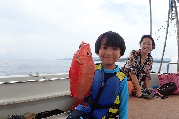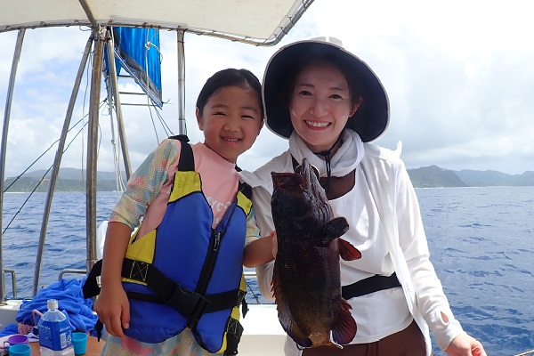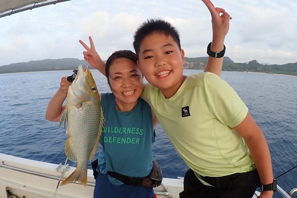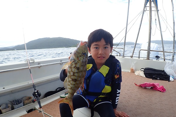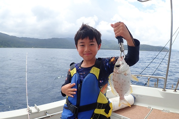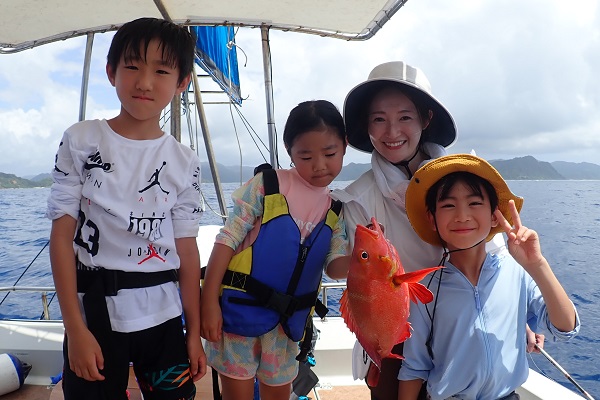 | 毎年夏休みに遊びに来てくれる常連ご家族。いつも夏休みの自由研究の素材を探しながら1日遊びに行っています。まずは釣りを開始。 沖から釣りをスタートしましたが、潮の流れが早く、台風のうねりもあり早々に浅瀬へ避難。しばらく小さな魚と遊び、食べれる魚を求めて水深50mへ。キツネウオやフエフキダイ、バラハタなどを釣り食材は確保。 その後もぽつぽつと食べれる魚をキャッチ!夏休みの自由研究はと言うと、カワハギの標本作りに決定してクマドリを3匹キープ。 まずは美味しいお魚を楽しんで下さい。 |