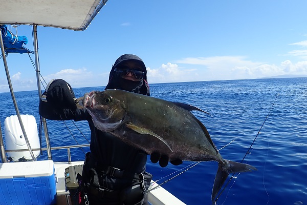 | 今日は朝から無風・凪の予報で、GTキャスティング・ライトジギング希望ということで仲の神島まで遠征に行って来ました。 前でキャスティング、後ろでジギングというスタイルで釣り開始。 すぐに良型のナンヨウカイワリをキャッチ!今日は潮の流れもなく、キャスティングには厳しそうだったので、2人でジギングを開始すると、 コンスタントにバイトがあり、バラシも少なくとっても楽しめたみたいです。次回はもう少し深めのポイントでサイズアップ狙いたいですね。 |