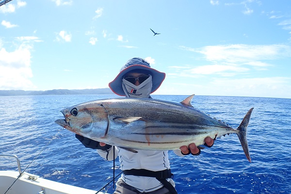 | 常連さん最終日の今日。昨日・一昨日と至る所にナブラが湧いていたので、鳥を見つけてナブラ撃ち&深海ジギングをしてきました。 水深300m前後のポイント周辺では鳥が集まり、時々カツオのナブラが湧きます。船を風上に入れて、ルアーを投げて高速巻き。ドンピシャ良い所に投げるとぷりっぷりの本カツオが釣れました。しかし鳥が忙しく小魚を追いかけるのも満潮直前の一瞬のみ。その後は深海ジギング、カンパチジギング・アカジンジギングと色々と試しましたが大撃沈・・・。 今晩の刺身は釣れ、4日間の釣行はこれで終了となりました。 また来月、お待ちしておりますね。 |
