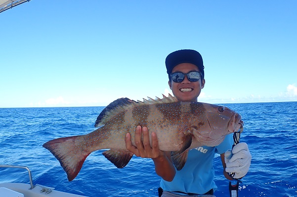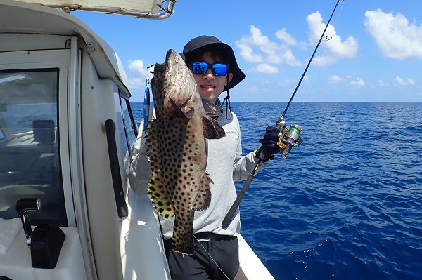 | 今日は昼から雨予報の西表島。風も北風になる予報ですが、1日沖へ出てアカジンを狙ってきました。 昼前には雨の西表島。釣果というと、最初のポイントで本命のアカジンをキャッチ!その後も浅瀬で粘りましたが、 着底と同時に美味しそうなヒトミハタが釣れました。 その後は、深場に移動しましたが潮の流れが早くて釣りにならず浅瀬へ引き返してきて、 マダラハタを追加。フエフキダイの活性も低く、釣れたのは数種類のハタでした。水深90mでは謎の大型根魚とバトルして負けました。 また来月もお待ちしております。 |