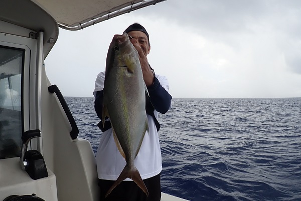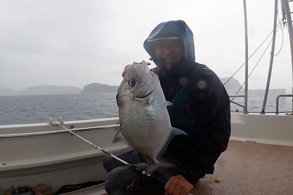 | 今日も波1mの良い海況です。ベタ凪スタートの仲の神島ジギング。 仲の神島を越えてさらに遠くの落ち際180mから釣りスタートです。 アオチビキから始まった今日の釣り。スマやマーマチ、小カンパチ等バイト多数、サメも多数。その中でも時々大型バイトもありましたが、残念ながらラインブレイクが続きました。 あれだけ晴れていたのに、一時大雨に!30分以上は降り続き船も身体も雨でキレイすっきりです!! 大雨が通り過ぎて、水深150〜120mのかけ上がりポイント。色々な魚種が混じり、最後の1尾はアオチビキ。昨日とは魚の活性が全く違く、バイトが多い1日でした。特別パターンがある訳ではないので難しい日でもありましたが、たくさん釣っていただきました。 |