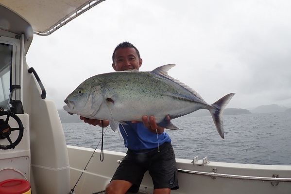 | 今日は朝から大雨の西表島。雨にも負けず、ジギング&タイラバで美味しい魚を探してきました。 背景から分かるように大雨です。しかし魚探の反応は良く、早々にカイワリをキャッチ!ジギングでは、 立派なカスミアジを船長自ら釣り上げてしまいました。久し振りに引きが強くわくわくした魚を釣り上げました。 湾内ではキツネフエフキ深場でキャッチ!!その他にもハタを数種類釣り上げて、食べる分は十分確保となりました。 |