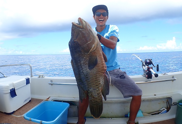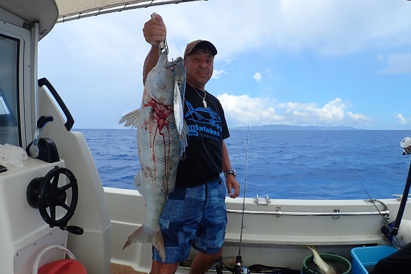 | 波1mのベタ凪予報も今日で終了予報。2日連続で仲の神島まで行き、グルクン泳がせ釣りで怪魚釣りです。 昨日よりも潮の流れが落ち着き釣りやすくなった今日。釣り開始1投目からコクハンアラをキャッチ!しかし食いが浅く、アタリももぞもぞとしたアタリです。その後はアタリが遠のき、移動の繰り返し。 お昼の満潮直前〜下げ潮に潮が変わるタイミングで時合突入!! 船長自らレア魚のナミフエダイ、ナポレオン、高級魚のアカジンとバタバタの1時間でした。時合終了後は再び沈黙の時間。仲の神島らしい釣果で2日間の泳がせ釣り終了となりました。 |